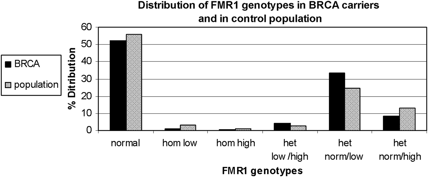 In conclusion, the CGG trinucleotide repeat in the FMR1 gene in Jewish Israeli women, predominantly of Ashkenazi origin, shows a distinct distribution among BRCA1/BRCA2 mutation carriers compared with the general population, but these differences are unlikely to account for the common phenotype of premature ovarian failure.