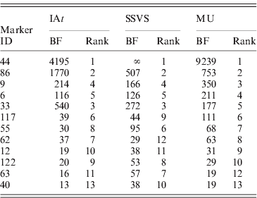 Table 1. Comparison of Bayes factors (BFs) for marker occupancy and ranks in the three competing models (Barley data). Results of 12 markers that are among the 10 markers with highest BFs in at least one model.
