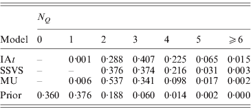 being 2·6 in MU, 2·9 in SSVS and 3·1 in IAt. Here, we should note that N Q aims at estimating the number of trait loci found in the marker data. As the marker data are from a 1·8 Mb candidate region, i.e. only a very small fragment of the human genome, N Q cannot estimate the total number of trait loci found in the entire genome and does therefore not allow any conclusions with respect to the genetic architecture of the trait. Table 3 shows the posterior distribution of N Q under the three models and its prior binomial distribution. The modes of the distributions show that MU supported models with two trait loci in the data, IAt models with three trait loci, whereas SSVS yielded models with two or three trait loci almost equally likely.