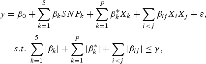 $$\eqalign{y & = {\beta _0} + \sum\limits_{k = 1}^5 {{\beta _k}SN{P_k} + \sum\limits_{k = 1}^p {\beta _k^\ast {X_k} + \sum\limits_{i \lt j} {{\beta _{ij}}{X_i}{X_j} + \varepsilon \comma \; } } } \cr & \quad s.t.\; \sum\limits_{k = 1}^5 {\vert {\beta _k}\vert + \sum\limits_{k = 1}^p {\vert \beta _k^\ast \vert + \sum\limits_{i \lt j} {\vert {\beta _{ij}}\vert } \le \gamma \comma \;}}}$$