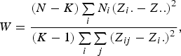 $$W = \displaystyle{{\lpar N - K\rpar \sum\limits_i {{N_i}{{\lpar {Z_i}. - Z..\rpar }^2}} } \over {\lpar K - 1\rpar \sum\limits_i {\sum\limits_j {{{\lpar {Z_{ij}} - {Z_i.}\rpar }^2}} } }}\comma \;$$