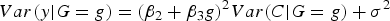 $Var\lpar y\vert G = g\rpar = {\lpar {\beta _2} + {\beta _3}g\rpar ^2}Var\lpar C\vert G = g\rpar + {\sigma ^2}$
