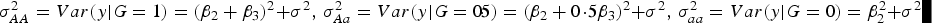 $\sigma_{AA}^2 = Var\lpar y\vert G = 1\rpar = {\lpar {\beta _2} + {\beta _3}\rpar ^2}+ {\sigma ^2}\comma\ \sigma _{Aa}^2 = Var\lpar y\vert G = 0\!\cdot\!5\rpar = {\lpar {\beta _2} + 0\!\cdot\!5{\beta _3}\rpar ^2} + {\sigma ^2}\comma\ \sigma _{aa}^2 = Var\lpar y\vert G = 0\rpar = \beta _2^2 + {\sigma ^2}$