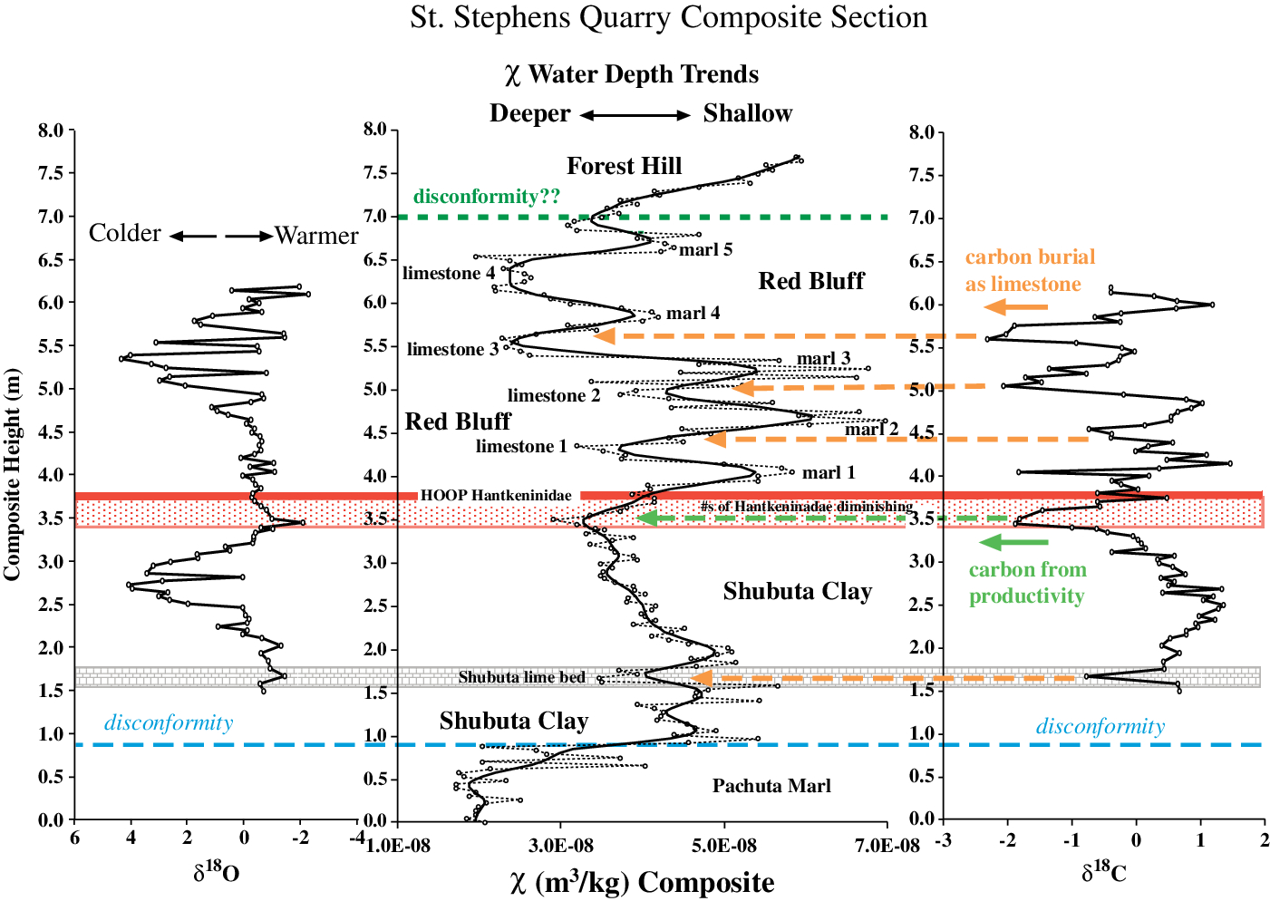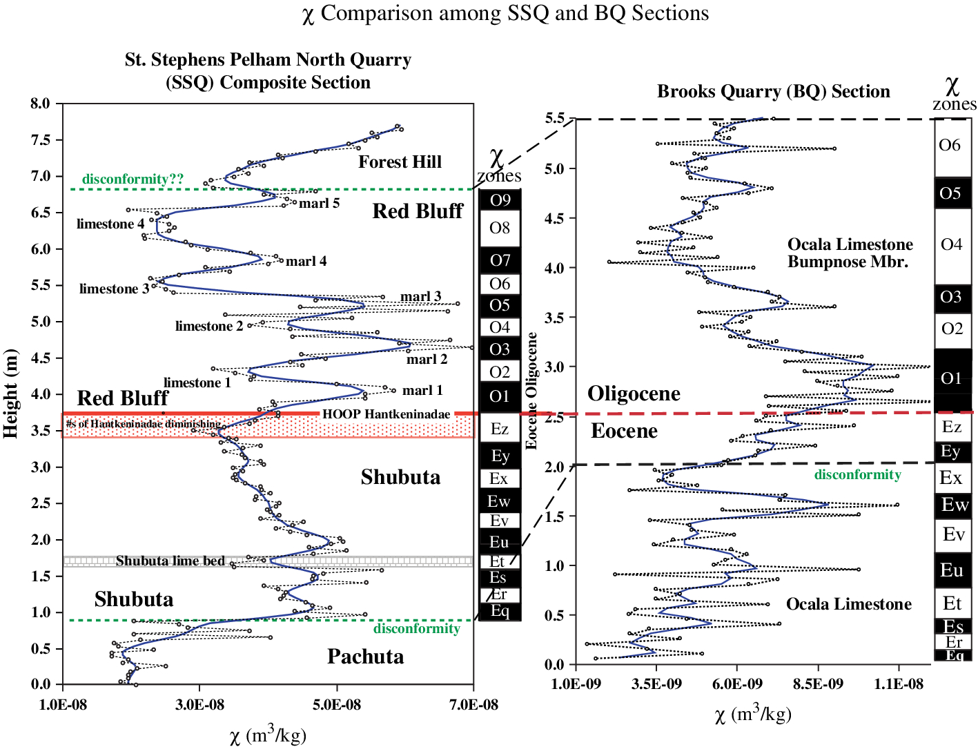 Our preliminary biostratigraphic interpretations, based on finding Asterocyclina americana in the Bumpnose Member of the Ocala Limestone in the BQ section (insert in Fig. 2), indicated that at least the basal ∼0.1 m of the Bumpnose Member is Eocene. Using planktonic foraminifera, specifically the Eocene marker fauna Hantkenina alabamensis and Turborotalia cerroazulensis (Fig. 8), and χ data allows us to place the E–O boundary at ∼2.55 m above the base of our measured section (Fig. 2e).
