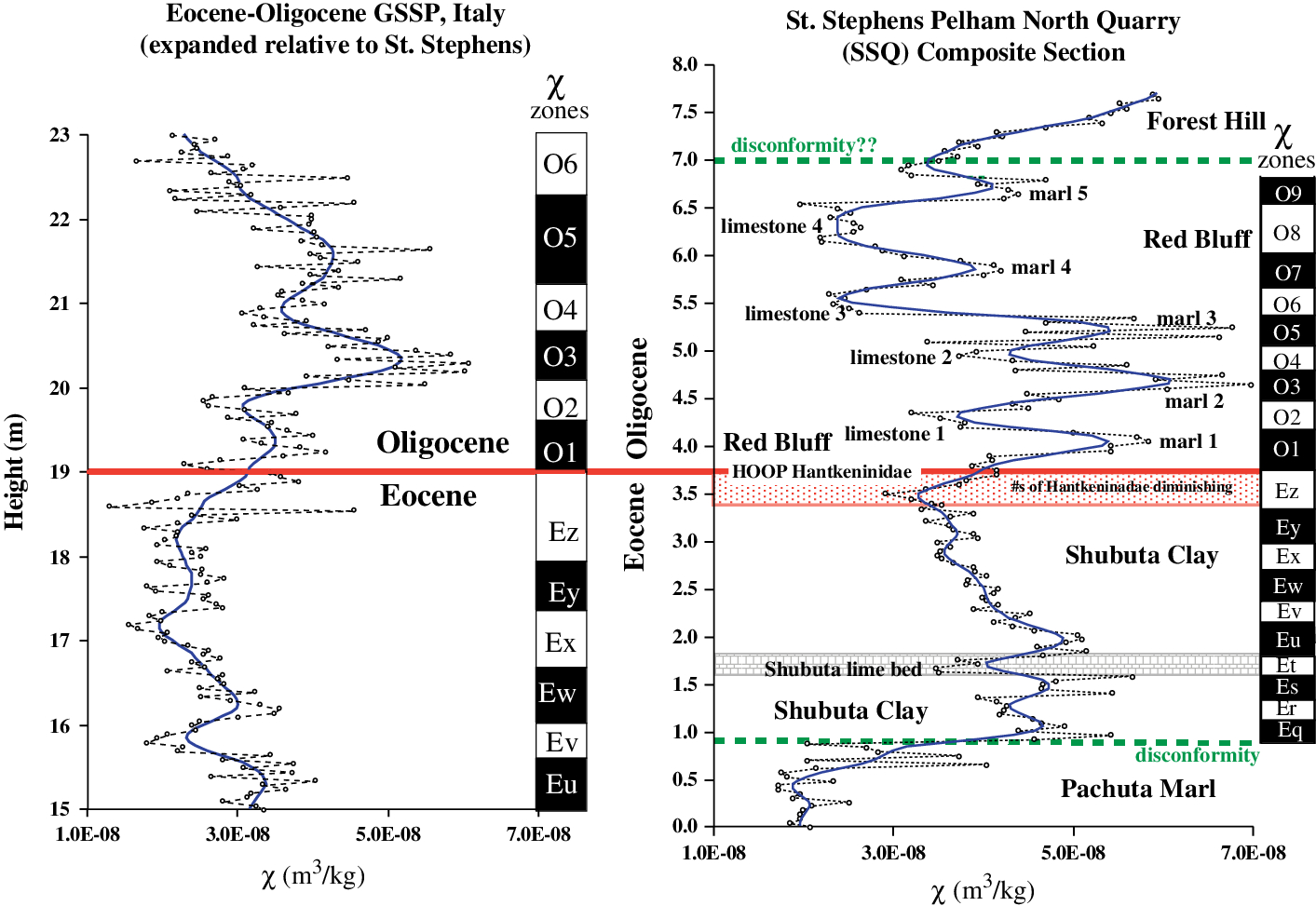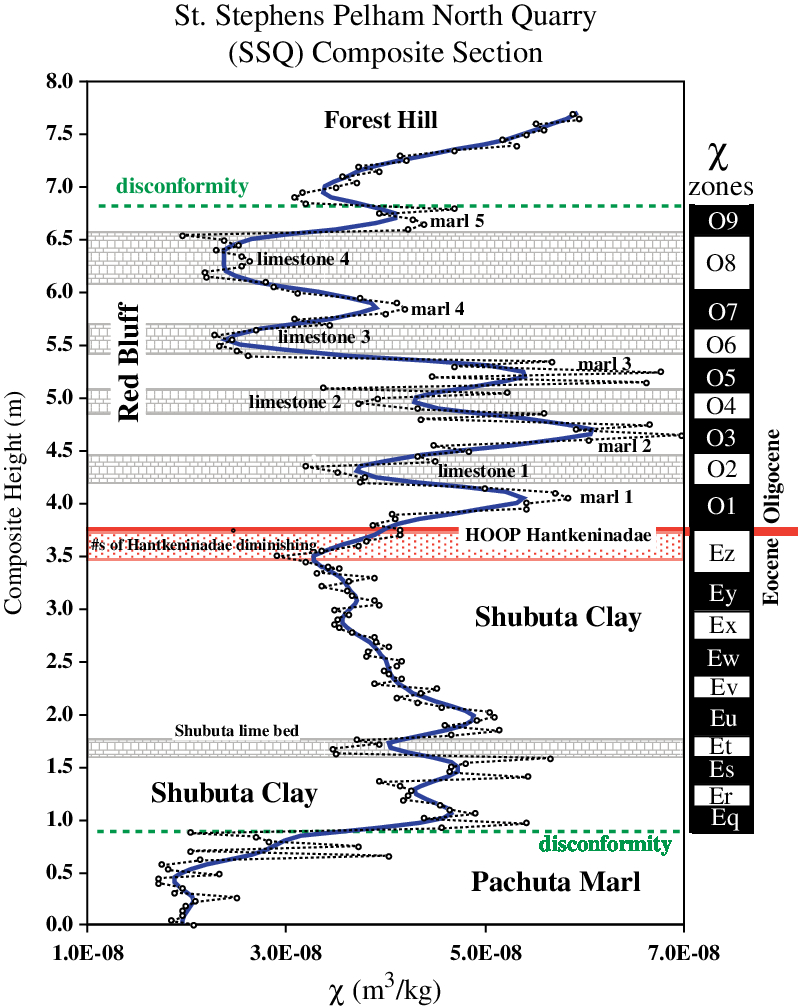 Fig. 9. Low-field bulk mass-specific magnetic susceptibility (χ) data for the St Stephens Pelham Hill North Quarry measured composite section. χ is reported as raw (dotted curve) and smoothed (solid curve) datasets; circles represent stratigraphic position of each sample collected. Lithology corresponding to Figures 2c and 5. χ bar-log zonation is constructed from the smoothed χ dataset, and χ zones are labelled: ascending through the Oligocene (O1–O9) and descending through the Eocene (Ez–Eq). The E–O boundary is represented by the solid red line and is identified by the HOOP (highest observed occurrence point) of Hantkeninidae, and lies at the top of the conformable transition from the Shubuta Clay Member into the Red Bluff Formation where Hantkeninidae diminish in size and at the top disappear from the section. Note that there is a disconformity between the Pachuta Marl Member and the Shubuta Clay Member identified by a distinctive hardground, wood fragments and a large change in the χ dataset. Based on an abrupt shift in the χ dataset, a second disconformity may exist between the top of the Red Bluff Formation and the overlying Forest Hill Formation.