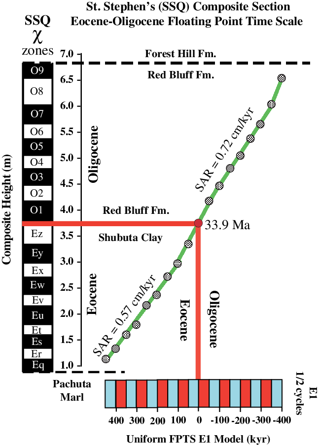 Fig. 16. The SSQ succession from the St Stephens quarry exhibits a relatively well-defined floating point time scale (FPTS) from a time-series analysis of ∼125 samples collected from a ∼6 m succession using raw unsmoothed χ data for the SSQ section bracketed by the two identified disconformities given in Figure 9. χ bar-logs (zones) constructed from the raw χ data (Fig. 9) are graphically compared to a uniform Milankovitch 100,000 year eccentricity climate model (Berger et al.1992), for the Eocene–Oligocene boundary interval, where each coloured bar represents ∼50,000 years. The intersections of the tops and bottoms of corresponding χ bar-logs and the uniform climate model bar-logs are plotted as stippled dots, and fits through these data are shown as LOC line segments. Using the individual segments, elements from the SSQ section χ bar-logs are projected onto the FPTS and assigned a total length of time of ∼0.9 Myr. This E1 eccentricity climate model provides a FPTS that can be adjusted as timescales change. LOC segments indicate similar sediment accumulation rates (SAR) of ∼0.57 cm kyr−1 in the Shubuta Clay Member and ∼0.72 cm kyr−1 in the Red Bluff Formation, indicating an up-section increase in SAR beginning just before the E–O boundary.