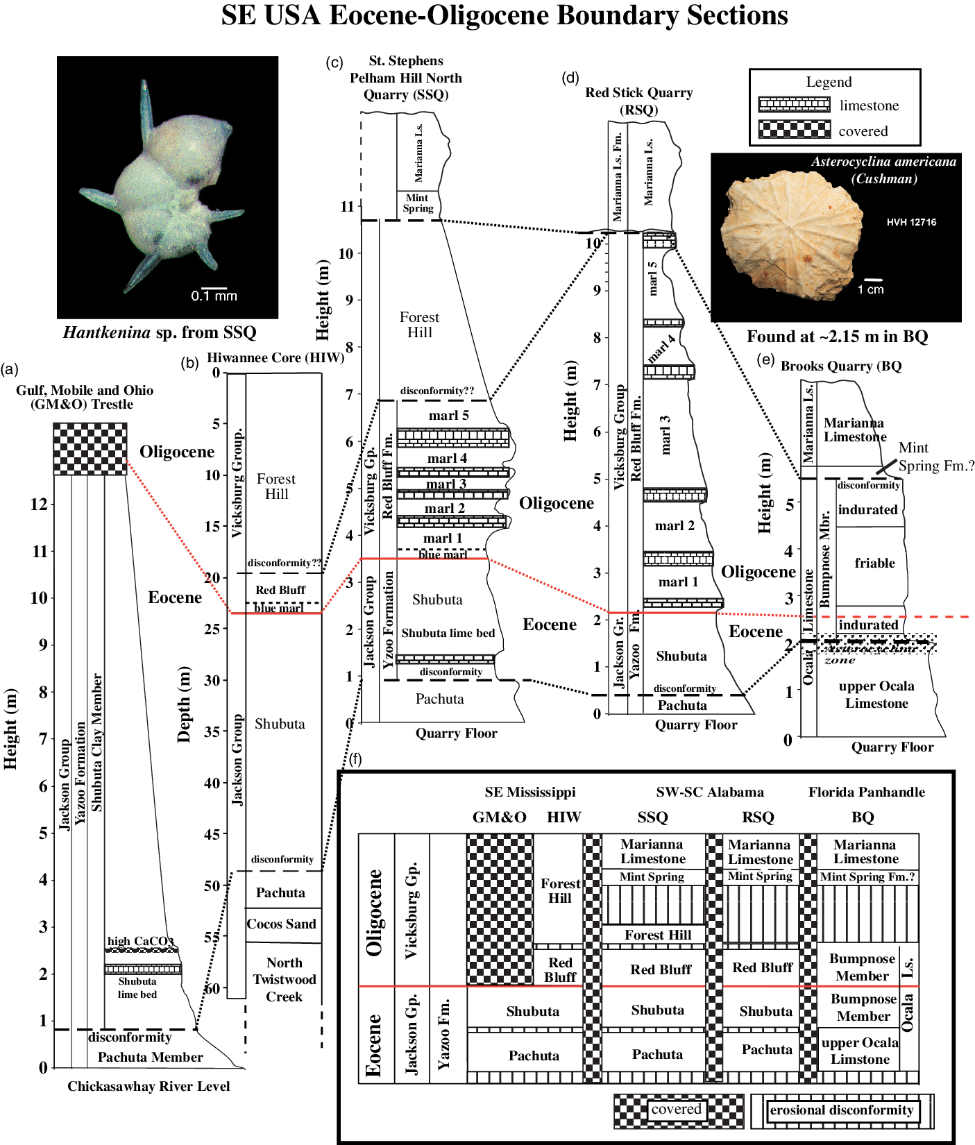 Fig. 2. Stratigraphy for sampled measured sections and the HIW core, which is directly correlated to a measured section cropping out ∼500 m to the WSW on the Chickasawhay River. Locations are given in Figure 1: (a) GM&O, (b) HIW, (c) SSQ, (d) RSQ, and (e) BQ. Solid red correlation lines represent the E–O boundary; dashed black lines represent unconformities. The E–O boundary is identified by the highest observed occurrence point (HOOP) of the Hantkeninidae family, and coincides with the transition from the Shubuta Clay Member of the Yazoo Formation, Jackson Group, into the Red Bluff Formation of the Vicksburg Group. (f) Locations as given in Figure 1, extending from SE Mississippi to the Florida Panhandle.