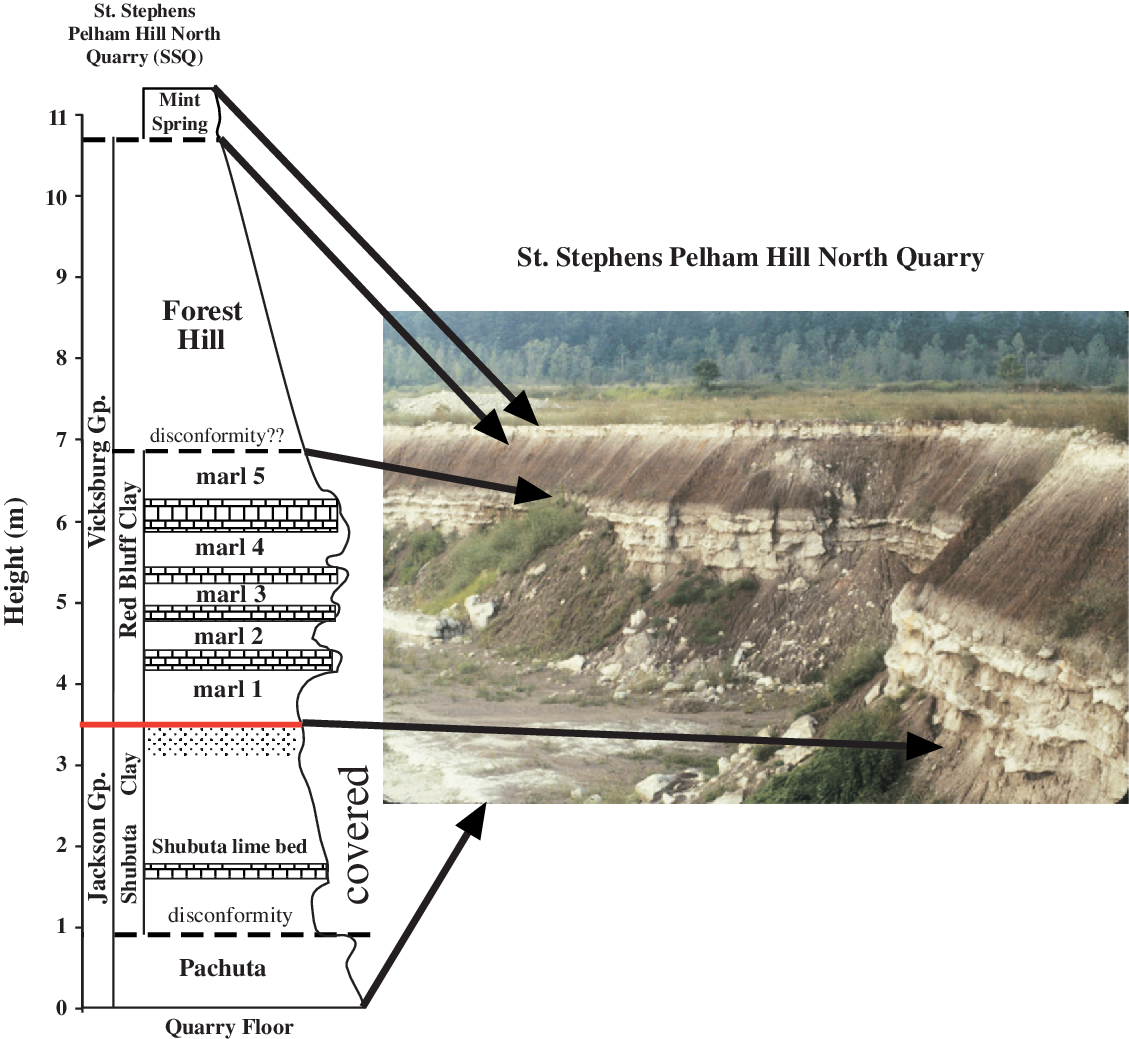 Fig. 5. St Stephens Pelham Hill North Quarry, near St Stephens, Alabama (SSQ, Figs 1, 2c), showing exposures of the Oligocene Red Bluff and Forest Hill formations, and Miocene Mint Spring Formation. Note that the Pachuta Marl and Shubuta Clay members of the Yazoo Clay Formation, Jackson Group, are covered intervals in the photograph and lie below the Red Bluff Formation. Stippled zone in the drawn section (left) represents the gradational transition from the Eocene Shubuta Clay Member into the Oligocene Red Bluff Formation, a zone in which Hantkeninidae diminish in size and disappear at the top. Note the light coloured interbedded marl–limestone couplets defining the Red Bluff Formation.