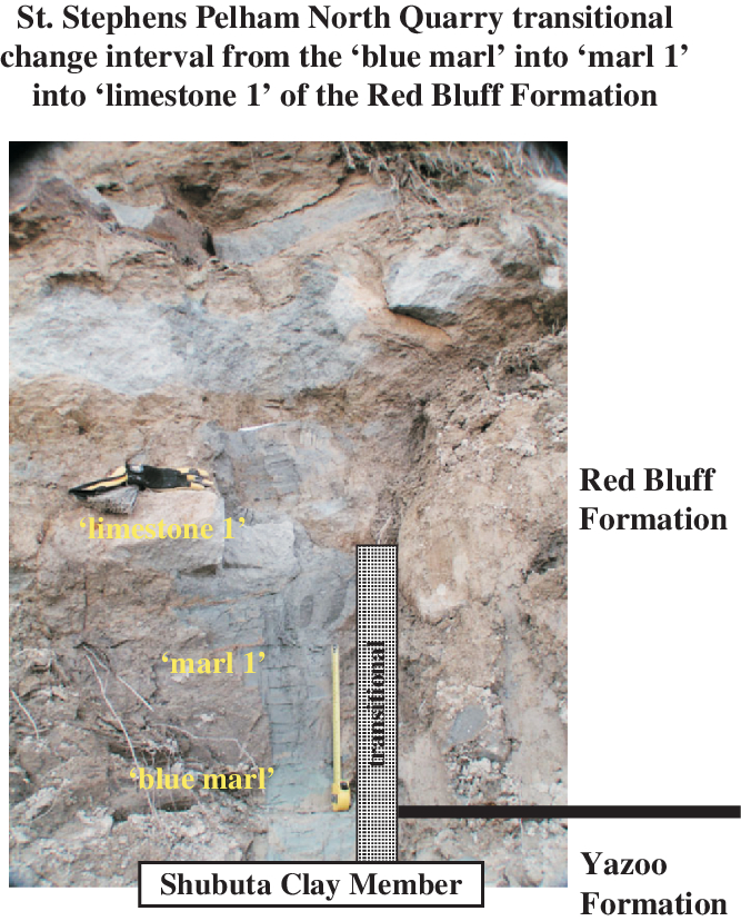 Fig. 6. The gradational transition in the St Stephens quarry from the glauconite-rich Shubuta Clay Member of the Yazoo Formation into the overlying darker specular pyrite-abundant Red Bluff Formation with the ‘blue marl’ colour variant at its base. Also shown are ‘marl 1’ and ‘limestone 1’ of the Red Bluff Formation (Fig. 2b). Tape measure for scale is extended 56 cm.
