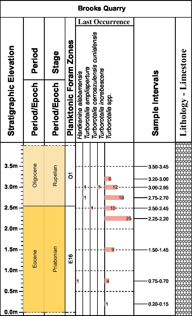 Seven samples were collected for biostratigraphic analysis through the ∼13 m of section exposed at the GM&O railroad trestle and these were examined for Hantkeninidae. All samples from the section contained Hantkeninidae specimens. Therefore, we assign all but the very top of the GM&O section, which was not sampled because it is deeply covered, to the Eocene (Fig. 2a).
