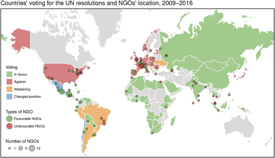 Figure 1. Countries’ voting for the UN resolutions and NGOs’ location, 2009-2016