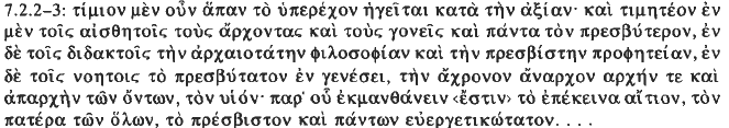 11 For example, “[The gnostic Christian] considers every kind of preeminence honorable in proportion to its worth. Among sensible things, rulers and parents and everyone who is older are to be honored; among things taught or learned, the most ancient philosophy and the earliest prophecy; among noetic things, that which is elder in origin, the beginning and firstfruit of all things, himself timeless and without beginning, namely, the son, from whom one learns about the ultimate cause, the father of all, the earliest and most beneficent of all existences.” Strom.
