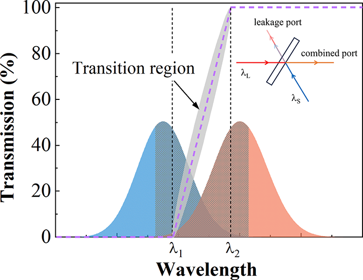 Figure 1 The typical transmittance curve of the LP-DM (purple dashed line), spectra of incident beams (shaded area) and their overlapping part (grid area). Here, λ1 and λ2–λ1 are referred to as the SW and TW, respectively. The inset shows the combining process.