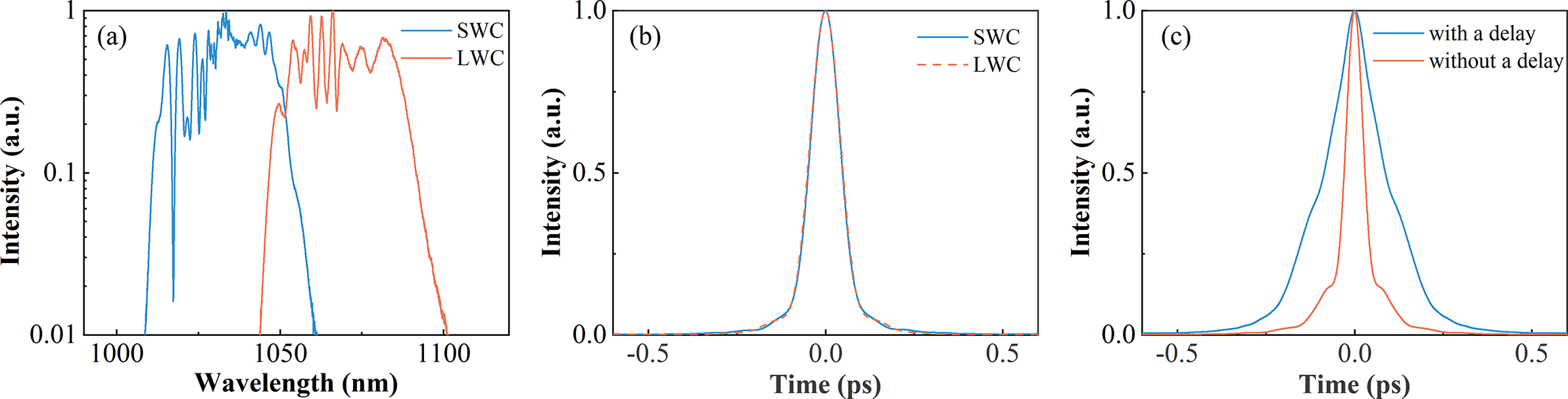 Figure 8 (a) The output spectra and (b) AC traces of two channels. (c) The AC traces of the combined beam with different delays.