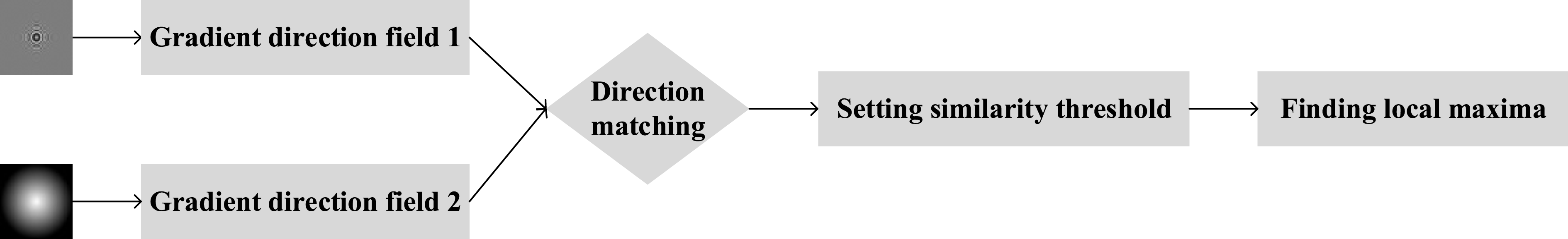 Gradient direction matching is done to calculate the similarity distribution after the extraction of gradient direction fields. Cosine function is used to remove the influence of inversion between some parts of the two direction fields. Fast Fourier transform (FFT) is adopted to remove the limit of template size on the computational efficiency. Similarity threshold is set according to the above matching results. Center of the diffraction ring is finally found out, which corresponds to the local maxima in the similarity distribution. The entire algorithm flow is shown in Figure 5.