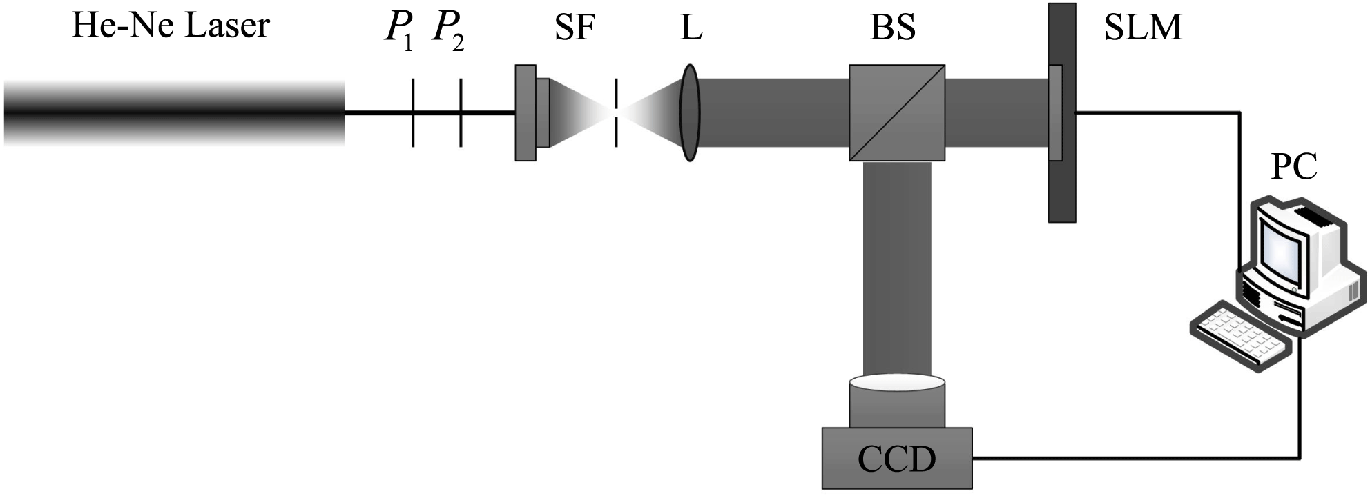In order to verify the effect of image compression on optimizing the performance of the GDM method to process actually collected images, the spatial light modulator (SLM) is used to simulate a pure amplitude defect[Reference Dudley, Vasilyeu, Belyi, Khilo, Ropot and Forbes21]. Optical path is shown in Figure 7. The incident beam is a plane wave with wavelength $\unicode[STIX]{x1D706}=632.8~\text{nm}$ in vacuum. $\text{P}_{1}$ is the polarizer, which is used to make the polarization direction be parallel with the long side of SLM. $\text{P}_{2}$ is the attenuator. BS is the beam splitter. CCD is the charge-coupled device. Diffraction images are collected at different distances.