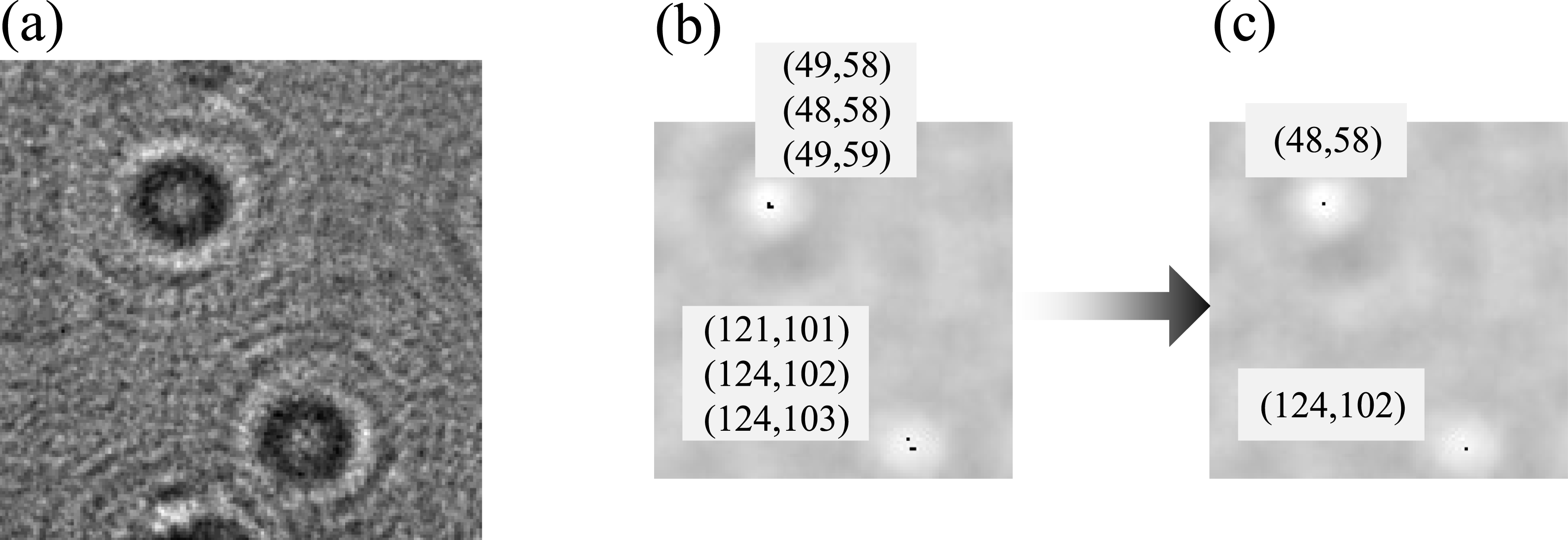 In order to verify the effect of cluster analysis on optimizing the practicability of the GDM method in processing a lot of images in a short time automatically, a damaged plate is used to induce a series of seriously disturbed diffraction images. The plane wave used in the above experiment is still utilized to irradiate the plate. Figure 9(a) shows the diffraction ring image collected at 41 cm. The image is seriously affected by both the two kinds of random noises. Therefore, it is first compressed with ratio of 0.2. Size of the compressed image is $155~\text{pixel}\times 155~\text{pixel}$ . Size of the matching template is $45~\text{pixel}\times 45~\text{pixel}$ . Both similarity matrices are $111\times 111$ in size. Figure 9(b) shows that six centers are initially detected, whose coordinates are labeled in the figure. Every three of them are closely spaced near one real center. Cluster analysis based on the minimum distance is adopted to classify these six centers and only two of them are left for the automatic operation, which is shown in Figure 9(c).