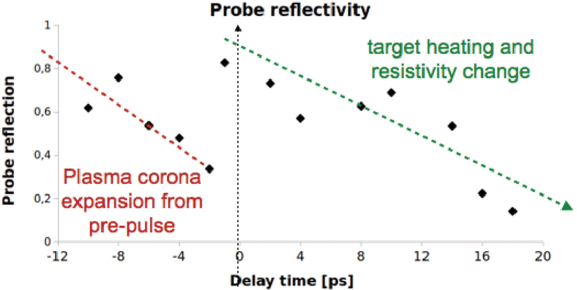 . The reflected beam was imaged onto an optical CCD camera, while a part of the transmitted beam is also recorded for reference. The setup is shown in Figure 5. Comparison of the amount of reflected probe beam at different delays will help for a preliminary interpretation and understanding of the laser contrast efficiency in laser–solid interaction; a further optimization of the diagnostic method will help to reconstruct the plasma density profile before, during and after the main pulse arrival by comparison to simulations. Figure 6 shows reflected fraction of the probe as a function of the chosen delay.