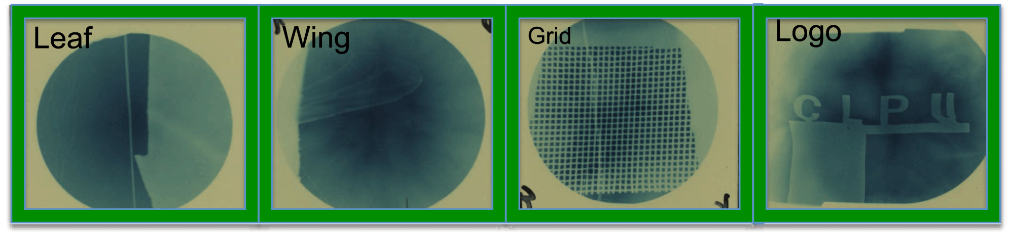 Figure 9. Proton radiography of (starting from left) a piece of leaf, a wing, a metallic grid and a CLPU metallic logo. The final image of the logo appears in the first RCF layer to be in a 20 mm