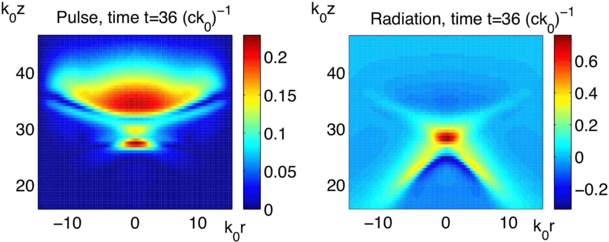 Figure 11. Cerenkov-like radiation (right) generated by pulse collapse into photon bullets (left) against longitudinal