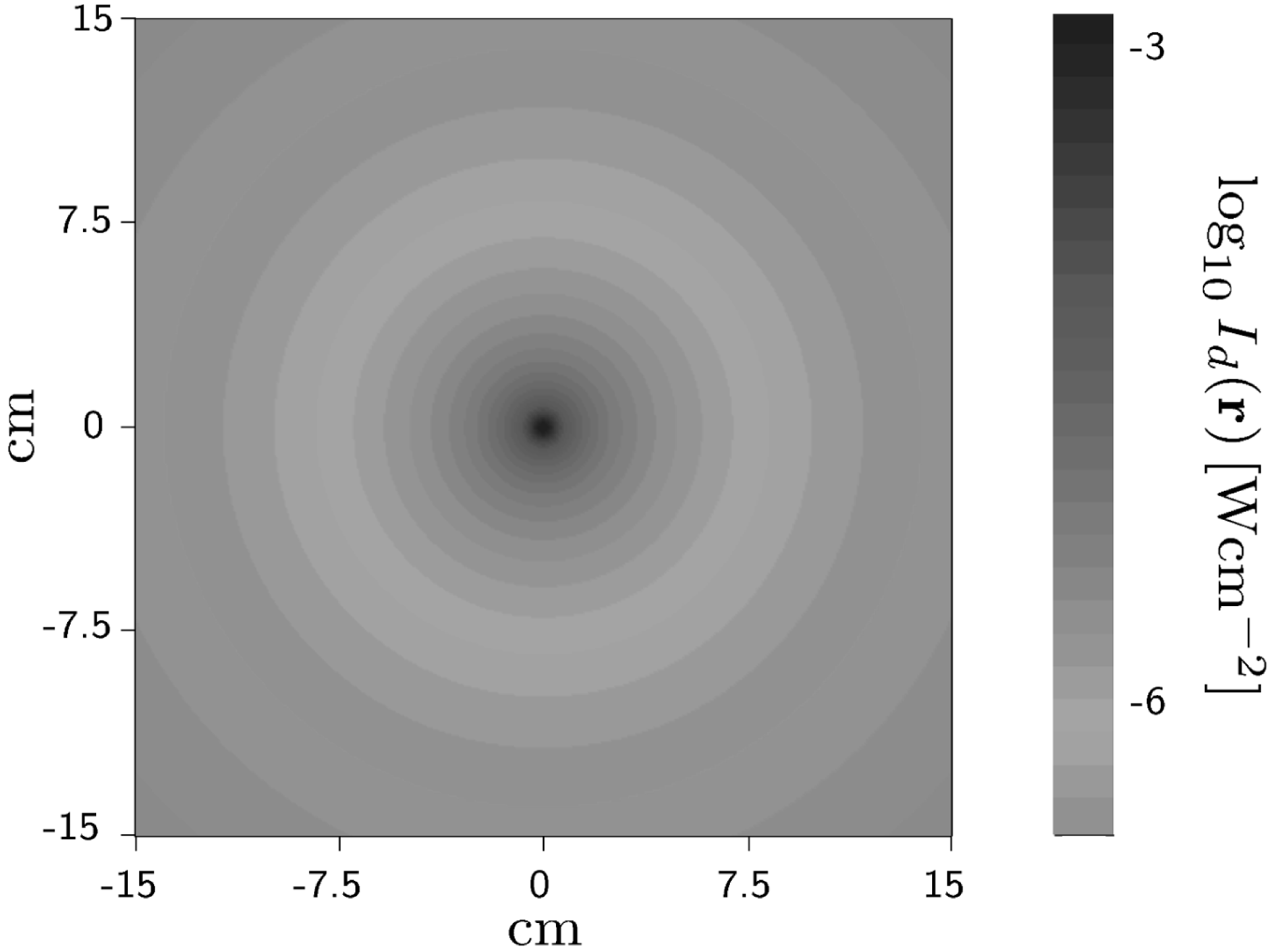 If the probe beam is considered to be much wider than the pump background, the region of polarized vacuum can be considered to ‘diffract’ the probe. An example of such a ‘single-slit’ diffraction pattern is given in Figure 6. It is well known that the far-field diffracted field is related to the Fourier transform of the aperture function[Reference Levi49], and via Babinet’s principle, this can be related to an integral over the region of refractive index different from unity. We underline the connection of this classical analogue to the intensity form factor of the scattering matrix approach Equation (13).