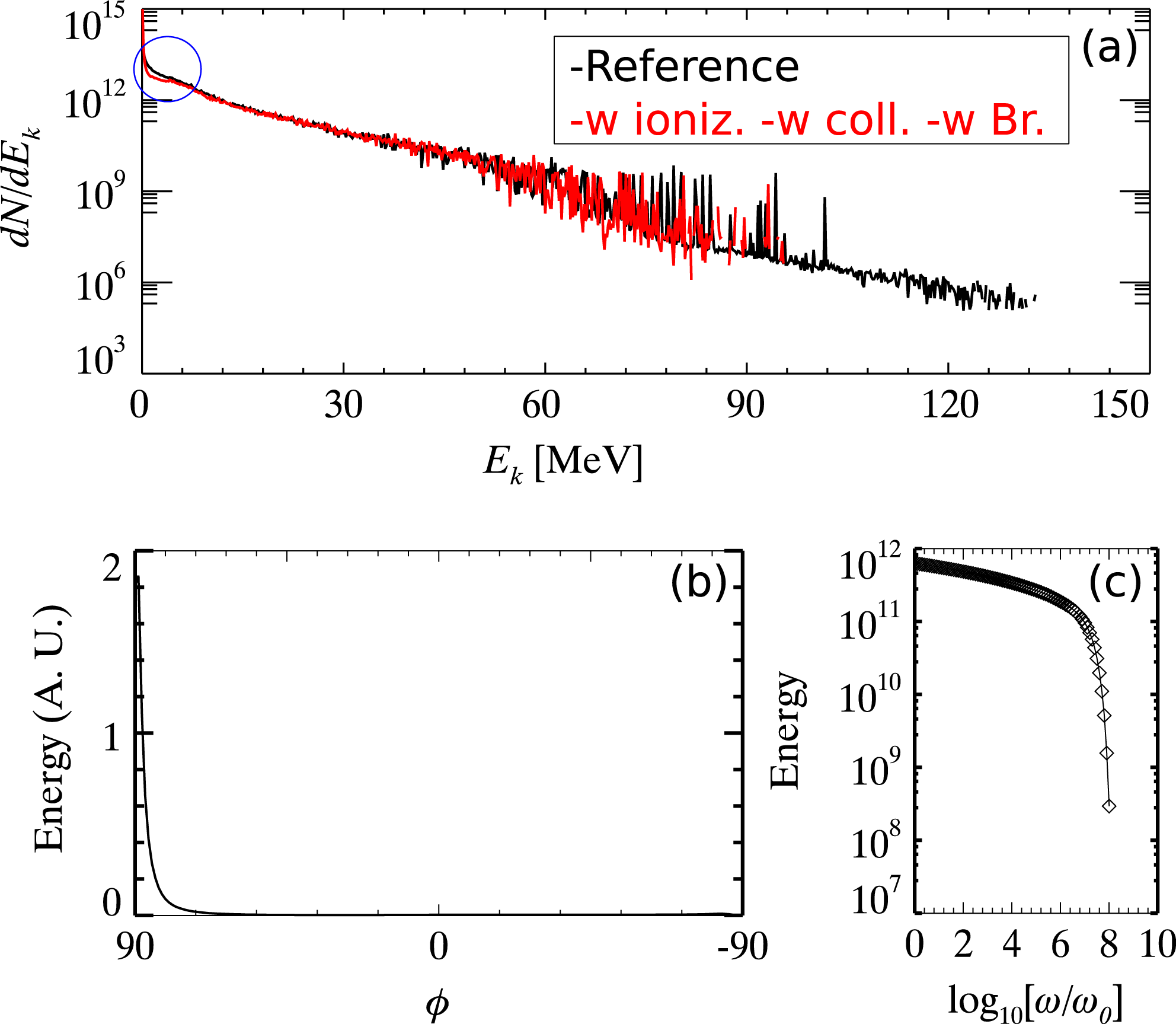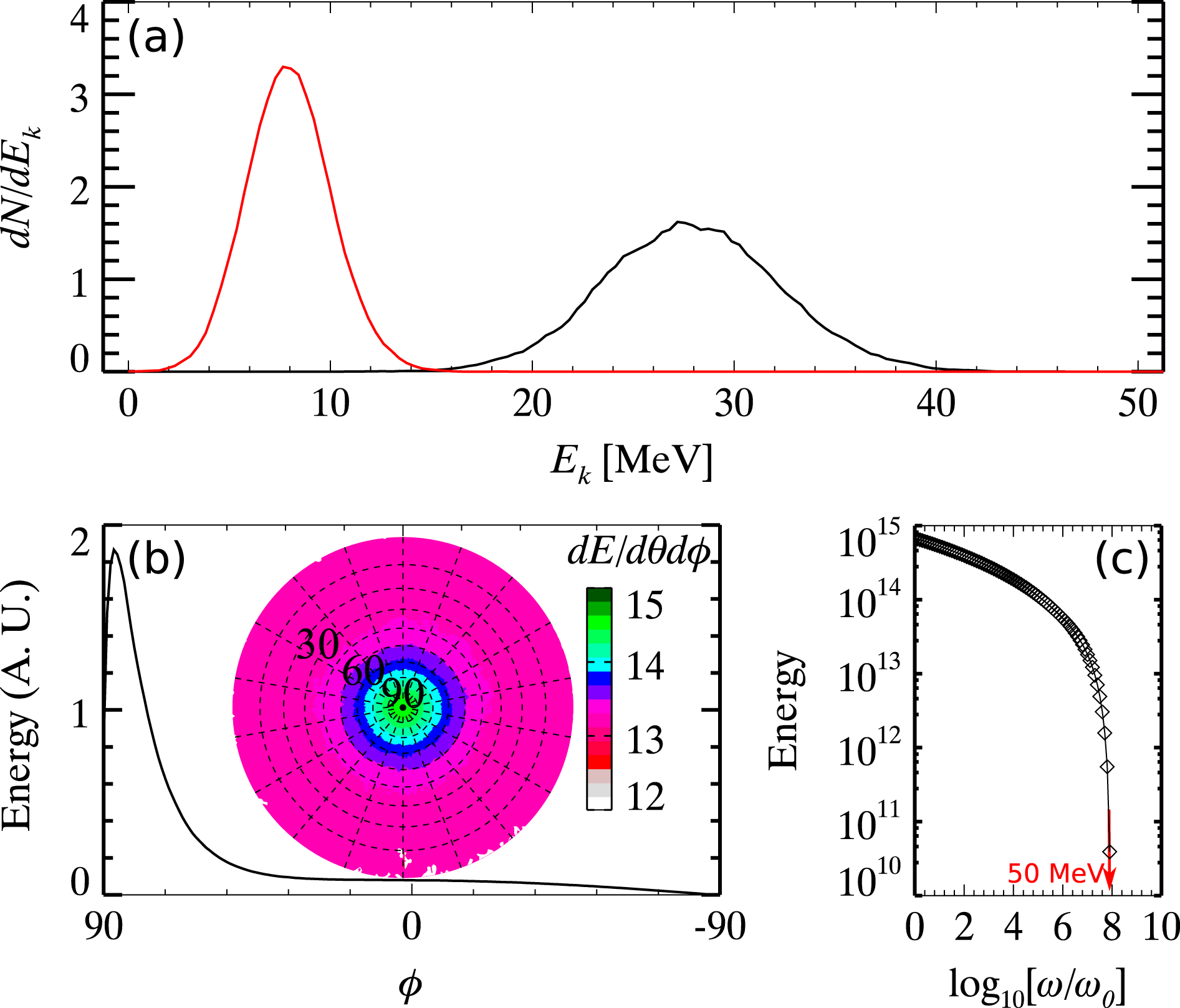 . The ‘cut-off’ frequency of emitted photons is significantly smaller than in 1D simulations. This is because, short laser pulse and pre-plasma scale length are used in 2D simulations. The maximal electron energy in 2D simulations is much smaller than that in 1D simulations.