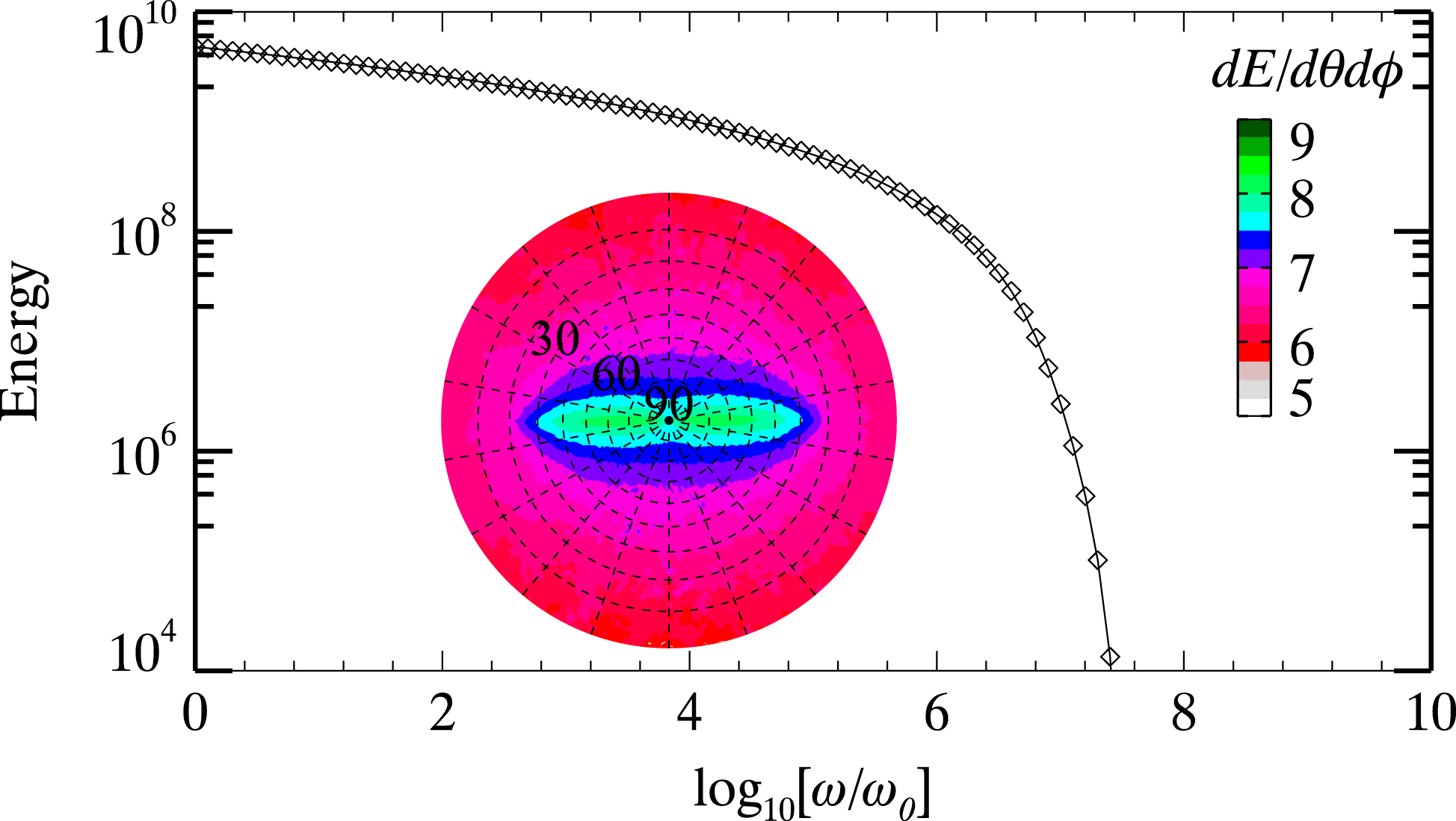 Figure 16. Results of 2D PIC simulations. Figure shows the angular distribution of emitted photons and the frequency spectra of emitted photons, where we have plotted