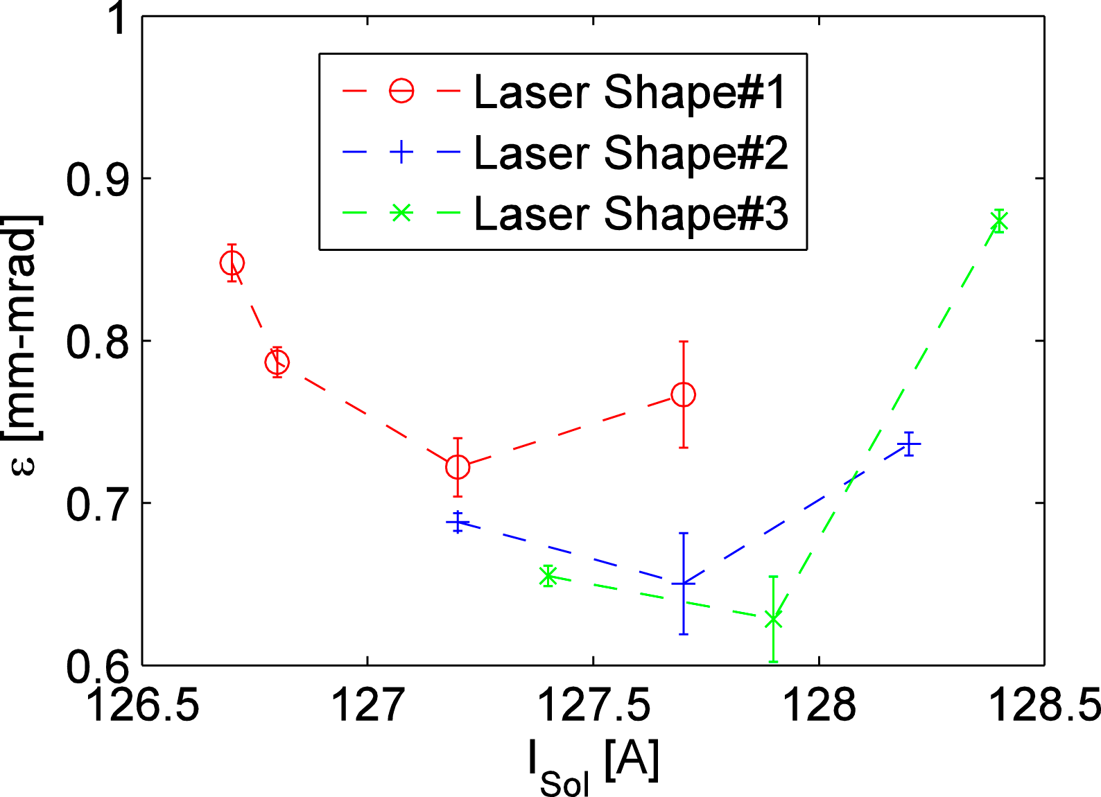 Figure 9 shows the three different transverse shapes of laser beam for the emittance measurement to determine the best shape. Figure 10 depicts the emittance as a function of the gun solenoid ‘S1’ current for three different transverse shapes of laser beam. The transverse shape #3 of laser beam is selected as the best among the three shapes.