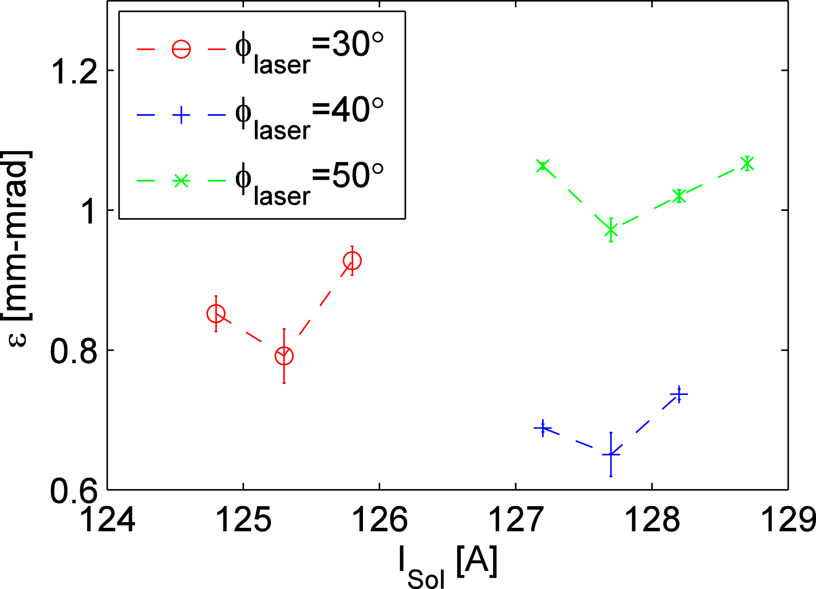 Figure 11. Emittance as a function of the gun solenoid current for three different laser injection phases using the laser beam transverse shape #2.