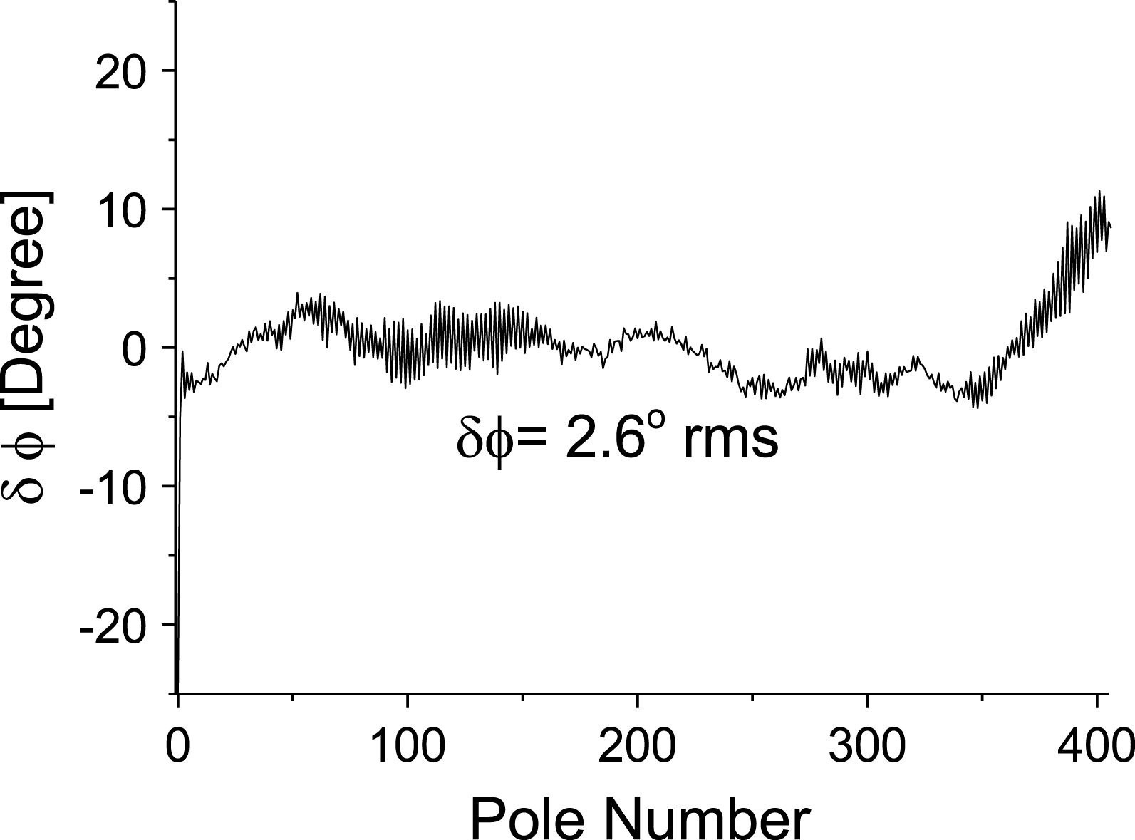 $\pm 1.0~{\rm\mu}\text{m}$ gap error. This error includes the mechanical hysteresis of the gap and the magnetic hysteresis of the pole, and is within our specification. Figure 21 shows the calculated phase jitter after pole tuning. The calculated rms phase jitter was