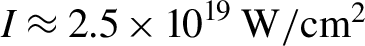 ${I\approx 2.5\times {10}^{19}\;\mathrm{W}/\mathrm{c}{\mathrm{m}}^2}$ on a spot of approximately