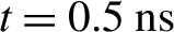 $t = 0.5\;\mathrm{ns}$. The particles are emitted from a circular surface of