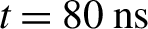 $t = 80\;\mathrm{ns}$, ion populations are visible: the peak around