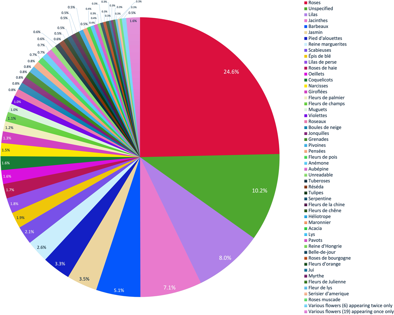 Of all the purchases that did specify the flower type, roses were by far the most common variety of flower. They accounted for 24.6 per cent of all flowers named in the bills, a figure that rises to 26.8 per cent when incorporating roses de haie, roses de Bourgogne, and roses muscades as well. An analysis of the number of consumers who bought roses reveals that 87.4 per cent of all customers who ordered flowers from Bertin requested roses at some point. Roses appear, therefore, to have been the standout choice for floral fashion.