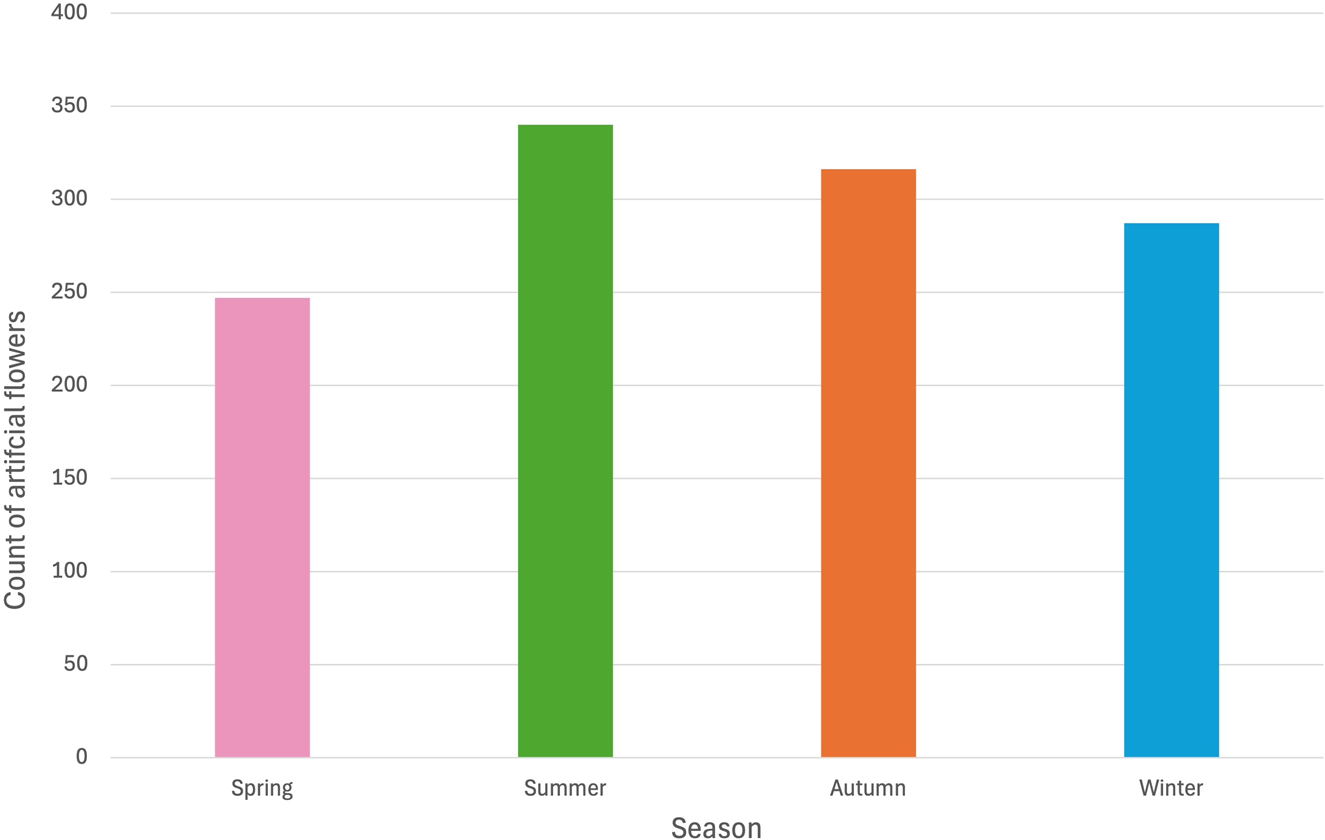 Another advantage of the artificial flower trade was that flowers could theoretically be produced in any season, without the limitations of nature imposed on the blooming of fresh flowers. The credit records indicate that artificial flowers were purchased all year round, with the numbers purchased in autumn and winter remaining comparable to those purchased in summer (Figure 11). The downturn in spring might be explained by the religious restrictions of Lent – a period of forty-six days falling between late February and early April (depending on the lunar calendar), during which time the purchase of new clothes and accessories was frowned upon.Footnote 51 It is also possible that artificial flowers in fashion were supplemented by real flowers during spring and summer, when most plants come into bloom. A month-by-month breakdown reveals that the two most popular months for purchasing flowers were January (139 flowers purchased) and July (144). As the accounts studied here only reflect purchases made on credit and never fulfilled, it is possible that customers wielded greater credit purchasing power at the beginning and middle of each year, since most accounting followed six-monthly schedules.Footnote 52 However, the small size of the dataset means that these explanations must remain tentative hypotheses, which can only be confirmed with further statistical analysis of other account books.