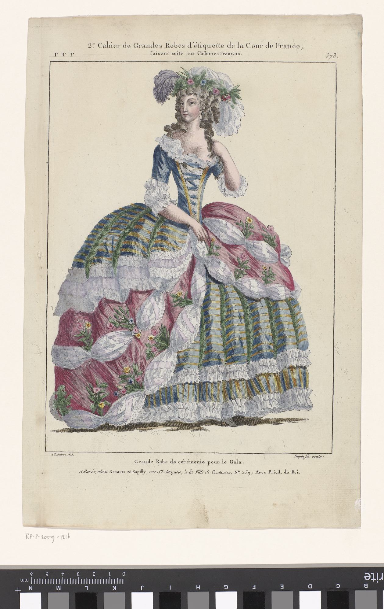 Figure 3. This fashion plate from the Gallerie des modes gives a sense of a ‘rich trellis’ of panniers covered in flowers, as described by the comtesse de Genlis. Nicolas Dupin, after a drawing by Augustin de Saint-Aubin, in Madame Le Beau, 2e cahier de grandes robes d’etiquette de la cour de France faisaint suite aux costumes français, Gallerie des modes et costumes français (Paris, c. 1787). Rijksmuseum, Amsterdam, RP-P-2009-1216. Open access, public domain.