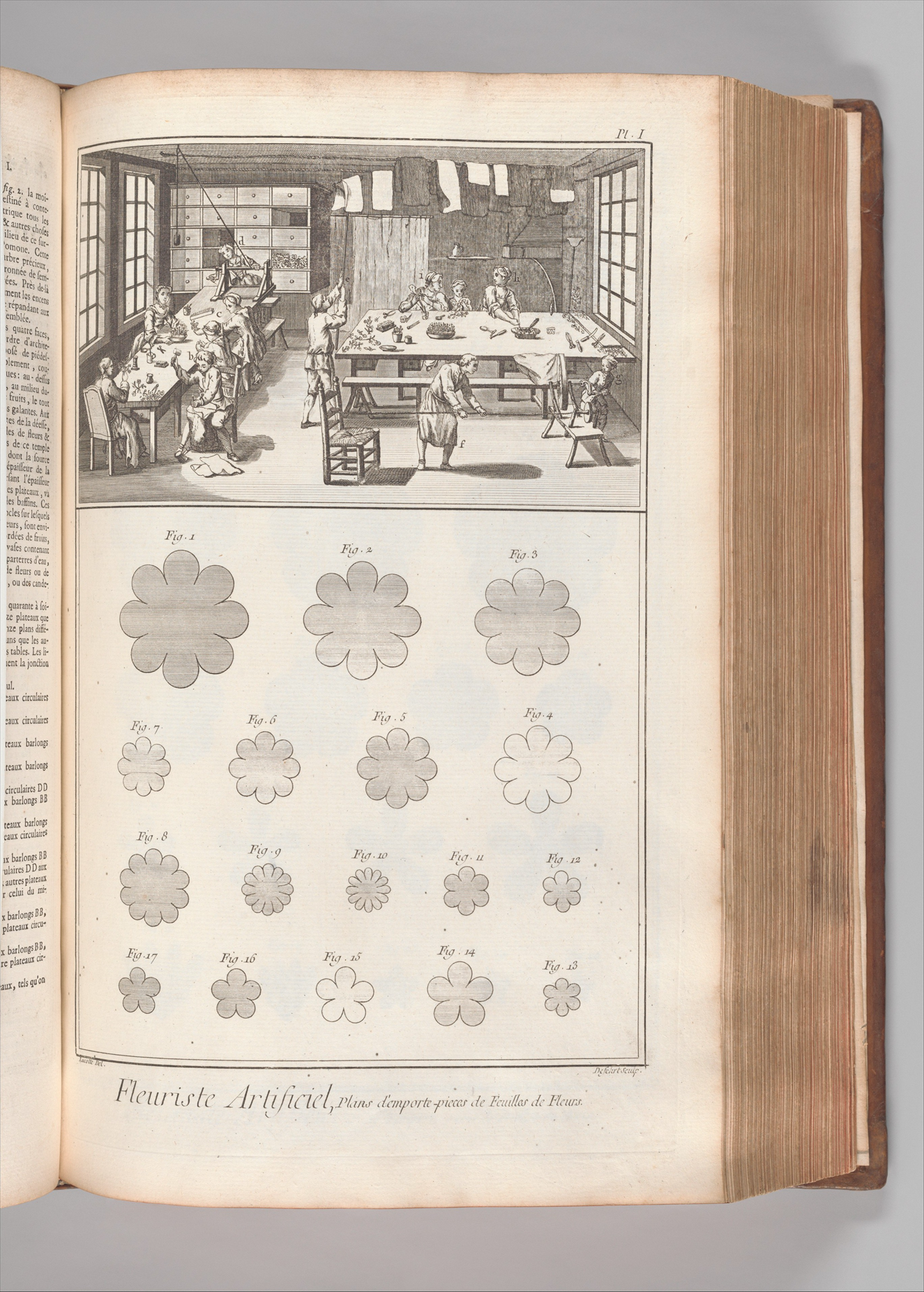 Figure 4. An engraved plate from Diderot’s Encyclopédie shows men, women, and children working in an artificial flower workshop. Men are employed in cutting and stamping shapes, as well as hanging fabric to dry, while mainly women and children are shown working directly with the flowers. ‘Fleuriste artificiel’, plate 1, in Recueil de planches sur les sciences, les arts libéraux, et les arts méchaniques (11 vols, Paris, 1762–72), iv, book 3. Metropolitan Museum of Art, New York, AE25.E531 1762 Q. Open access, public domain.