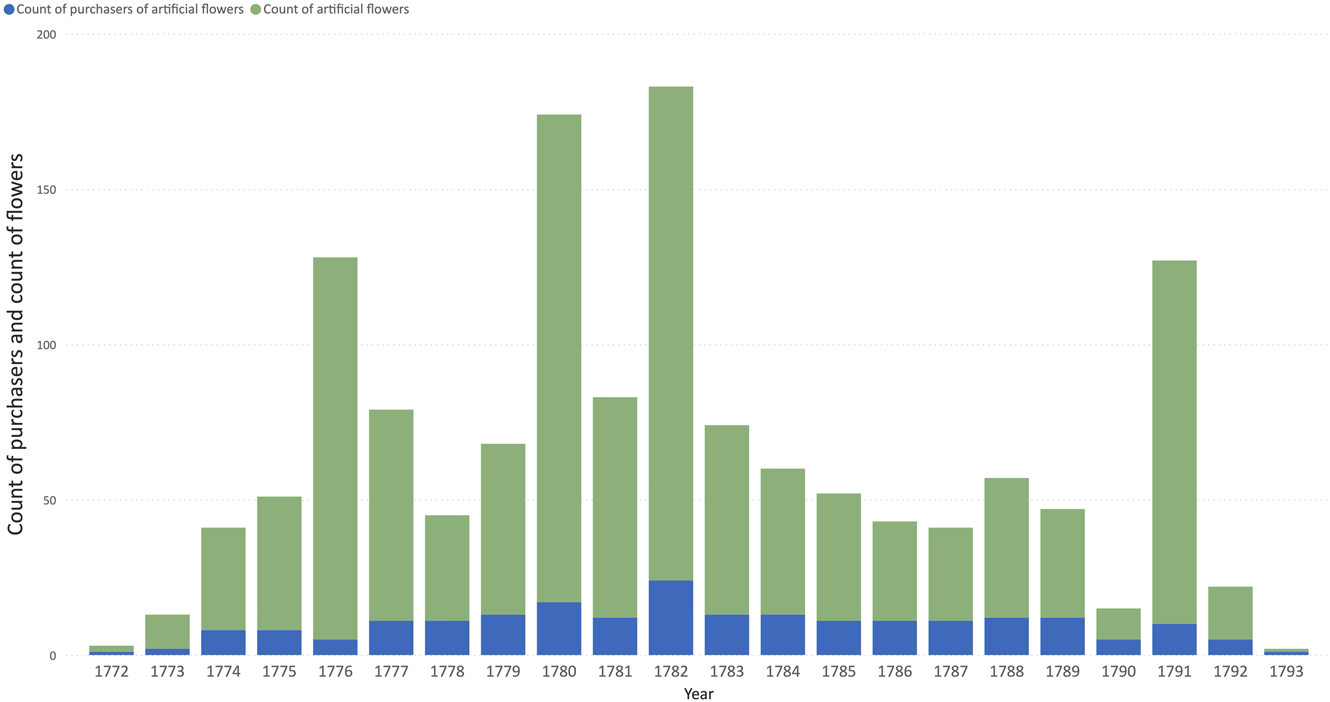 Figure 11. Artificial flowers purchased per season, in Marie-Jeanne Bertin’s credit records, 1772–93.