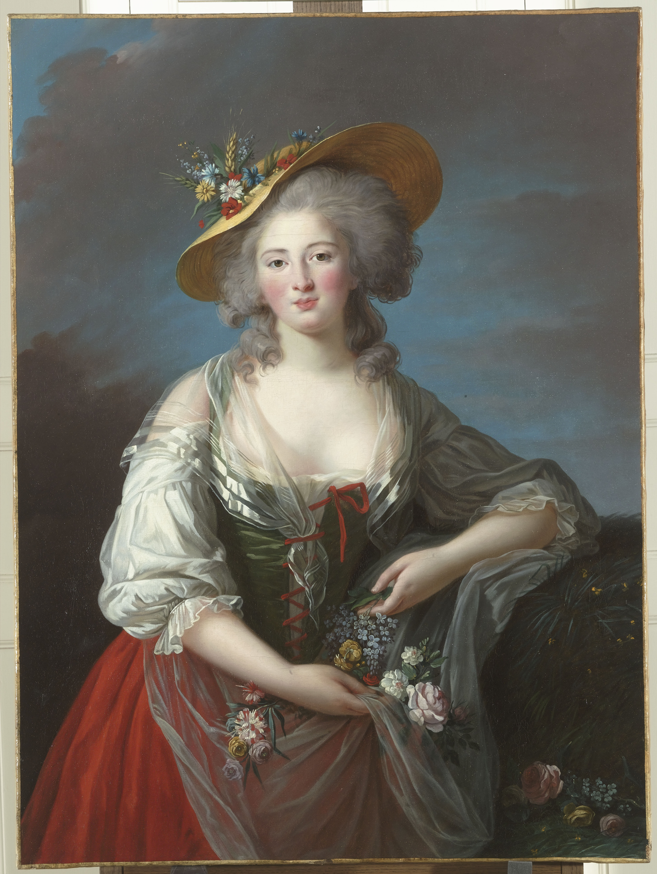 The presence of cornflowers among the most popular types indicates the prevalence of wildflowers in this dataset. Other wildflowers commonly ordered from Bertin included daisies, ears of wheat, poppies, and flowers described by the umbrella term fleurs de champs (‘field flowers’). The portraits of Élisabeth-Louise Vigée Le Brun from the early 1780s give an indication of how these might have been worn on the brims of straw hats (see Figure 6), and indeed many of the wildflowers in Bertin’s credit bills were sold attached to hats (chapeaux) or poufs.