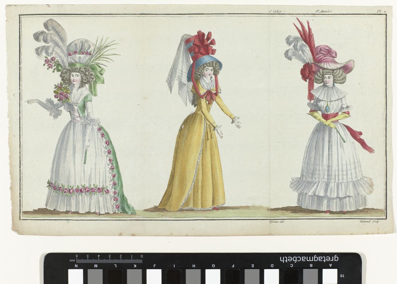 Figure 8. A. B. Duhamel, after Defraine, The first fashion magazine: magasin des modes nouvelles françaises et anglaises, 3e année, 2e cahier (Paris, 30 Nov. 1787), pl. 1, 21 × 35 cm. Rijksmuseum, Amsterdam, RP-P-2009-1283. Open access, public domain.