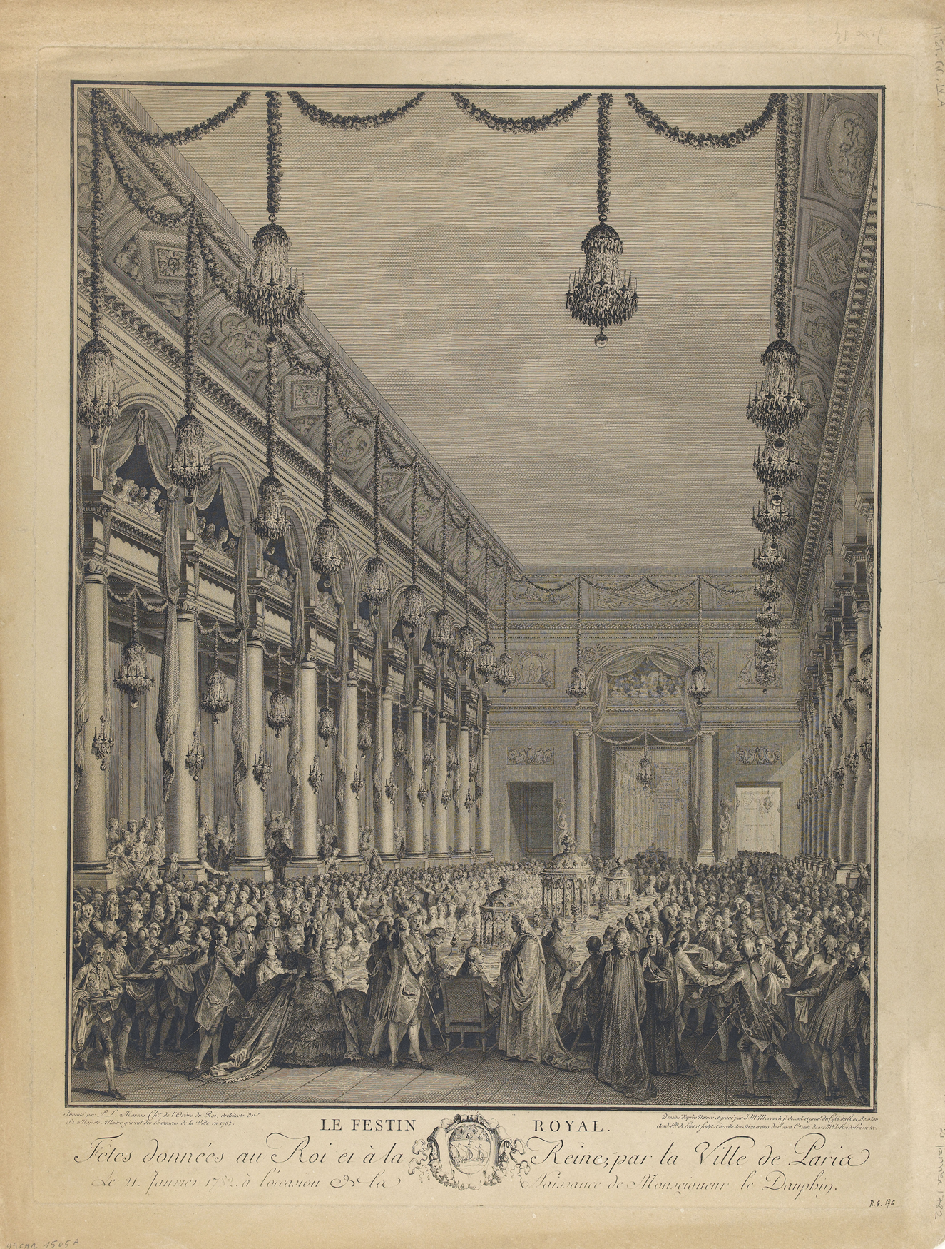 Figure 9. This engraving shows the celebrations for the dauphin in January 1782. Garlands of flowers decorate the chandeliers hanging from the ceiling and the sugar sculptures on the tables, and there is some impressionistic indication of flowers in the hair of women in the foreground. Jean-Michel Moreau, Le festin royal, engraving, 1782. Musée Carnavalet, Paris, G.175. Creative Commons licence.