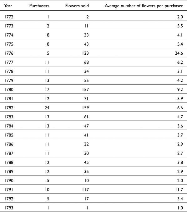 On average, the number of purchasers of artificial flowers gradually increased throughout the 1770s until 1782. However, there is a dip in purchaser numbers in 1781, and a significant decrease in the number of flowers they purchased. This is probably due at least in part to the death of Marie-Antoinette’s mother in late November 1780, which plunged Versailles into the strictest form of mourning dress (grand deuil) for six months, during which time women were prevented from wearing their usual colourful and extravagant accessories, including artificial flowers.Footnote 29
