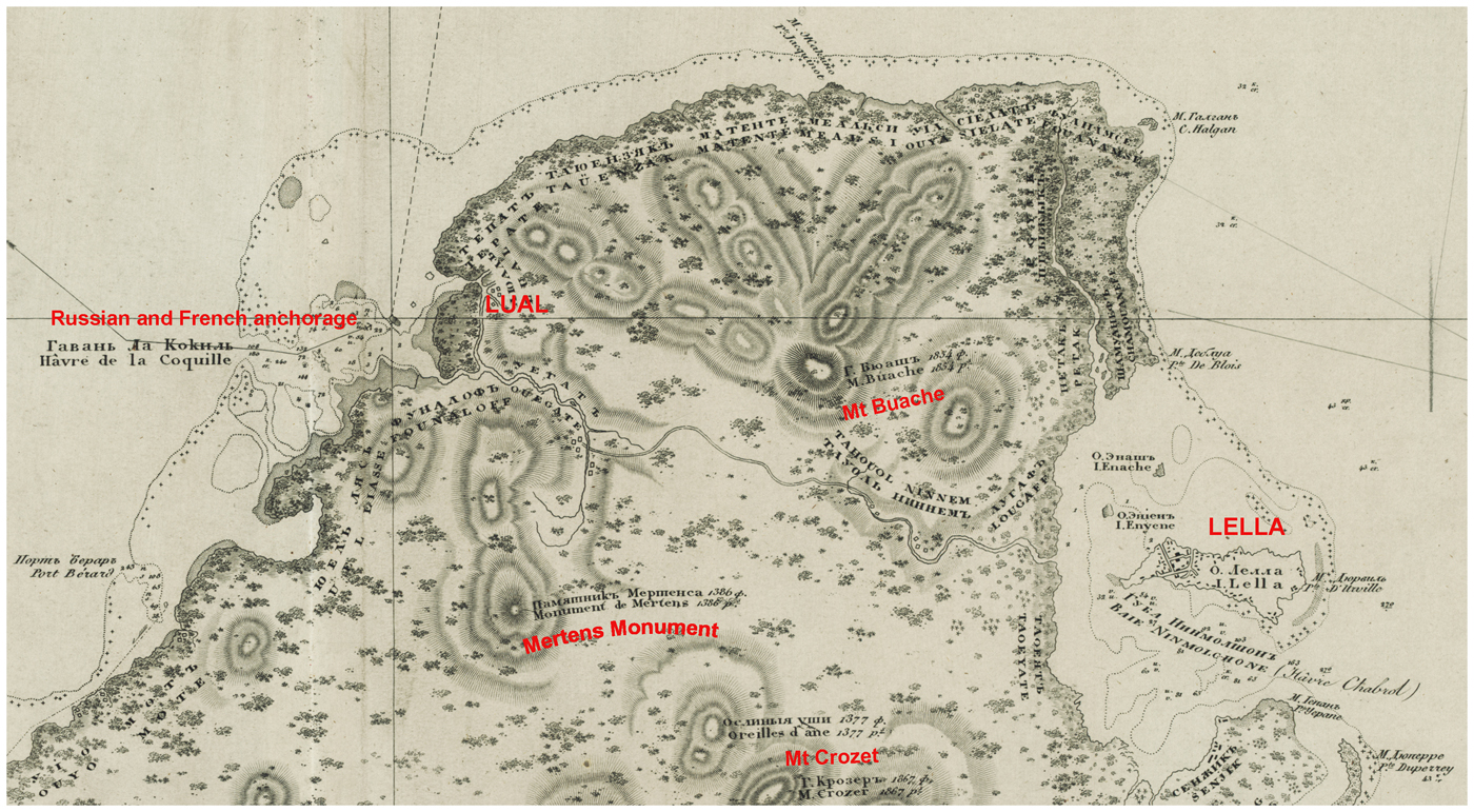 Fig. 10a. Fedor Litke, [northern part of Ualan (Kosrae)], in ‘Plan ostrova Yualana (Arkhipelaga Karolinskogo)/Plan de l’île Ualan (Archipel des Iles Carolines)’ ([1836]), National Library of Australia, Canberra, MAP Rm 3109/2, http://nla.gov.au/nla.obj-232183389