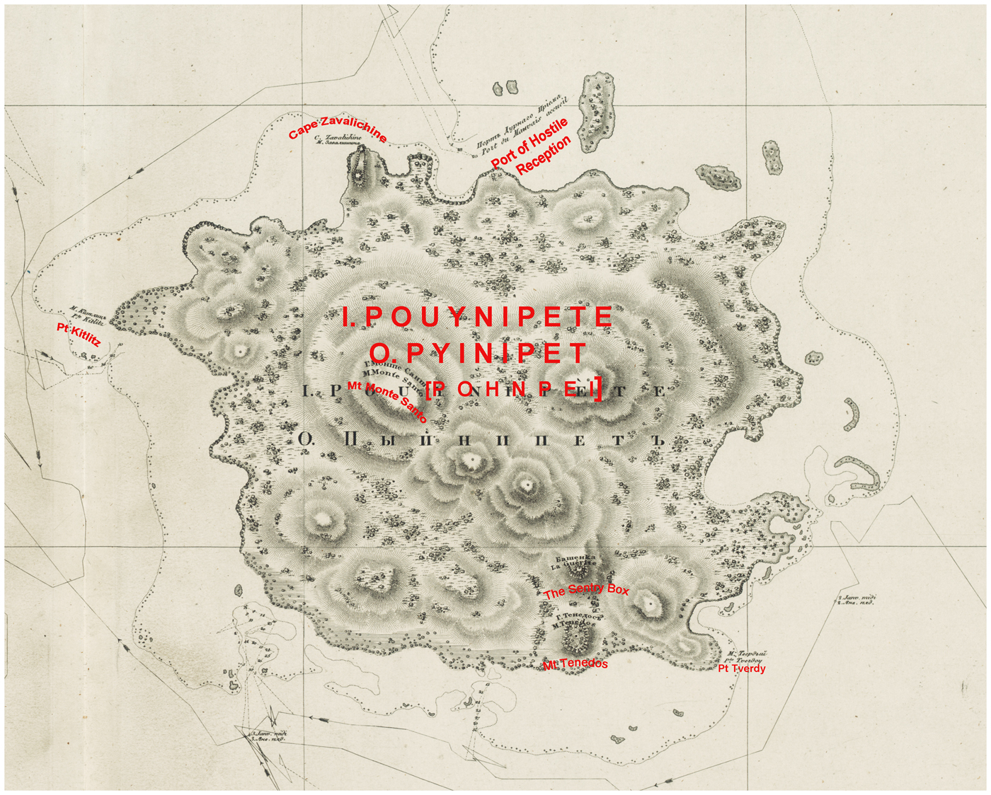 Fig. 11a. Fedor Litke, [O. Pyinipet/I. Pouynipete (Pohnpei)], in ‘Ploskaia karta ostrovov Seniavina (Arkhipelaga Karolinskogo)/Carte des îles Séniavine (Archipel des Iles Carolines)’, ([1836]), detail, National Library of Australia, Canberra, MAP Rm 3109/4, http://nla.gov.au/nla.obj-232183600