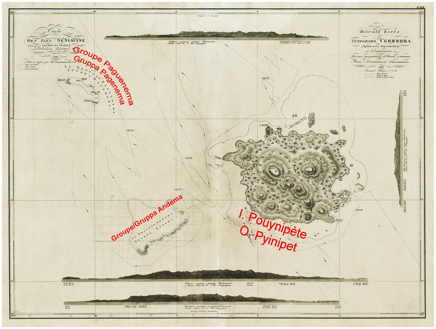 Notwithstanding these eclectic choices, Lütke's over-riding toponymic concern in this group was to know ‘the name that the natives give to the large island’. He thought it was probably ‘Pouynipète’, an opinion confirmed during a brief shipside encounter with several men ‘of the common sort’, who seemed ‘more reserved and more intelligent than the others’. They also taught him local names for the two small atolls and their constituent islands which complete the Senyavin group. Lütke duly inscribed Pouynipète/Pyinipet (Pohnpei), Andema (And or Ant), Paguenema/Pagenema (Pakin), and several islands within Pakin, as the only Indigenous names on his ‘Map of the Senyavin Islands’ (Figure 11). His faith in the accuracy of the term Pouynipète was further licensed by comparison with homophones in Kotzebue's maps of the Caroline Islands (Figure 6) and others heard subsequently at islands elsewhere in the archipelago.Footnote 96
