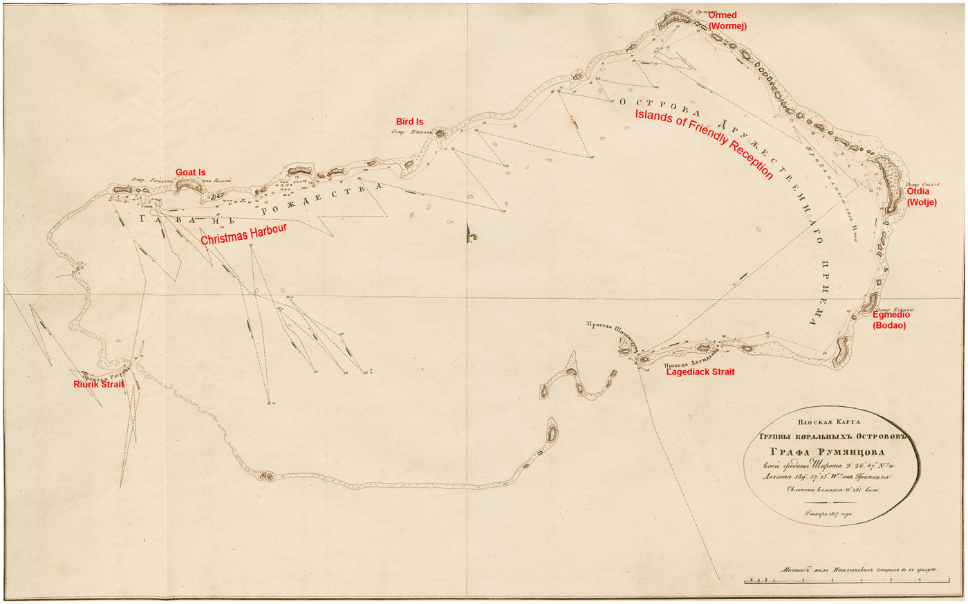 Kotzebue's more detailed charts equally reflect his emerging personal experience of specific places and populations. On 1 January 1817, sailing south-west from Hawai'i, he made a ‘new discovery’ and memorialized it as ‘New Year's Island’. He later learned that the Islanders called it Miadi (Mejit Island).Footnote 35 A subsequent French global atlas gives the island the dual appellation Miadi ou de la nouvelle année (Miadi or New Year (Island)).Footnote 36 Russian naming of the ‘Group of Count Rumiantsev’ (Wotje Atoll) was more convoluted. This large atoll in the central Ratak Chain was the axis of Kotzebue's interactions with Islanders during a month-long stay. He dedicated this major ‘discovery’ to diplomatic commemoration, calling the atoll collectively after the expedition's influential sponsor Nikolai Petrovich Rumiantsev.Footnote 37 Conversely, he modified his naming practice with respect to individual islands in accord with experience and his developing relations with the inhabitants. Entering the large inner lagoon through the south-western passage, Kotzebue initially used banal descriptive names for two uninhabited islands: Kozii (Goat) Island, where he left goats for local use, and Ptichii (Bird) Island. The ship's anchorage near Goat Island was named Christmas Harbour – the date it was first seen according to the Russian calendar.Footnote 38 As he sailed to the eastern, more densely populated part of the atoll and learned words of the Indigenous language, Kotzebue's nomenclature reflected his emerging grasp of local usage and celebrated Islanders’ conduct: he noted the island names Ormed (Wormej), Otdia (Wotje), and Egmedio (Bodao) and called the whole north-eastern group the Islands of Friendly Reception because the inhabitants were peaceful and hospitable towards the foreigners.Footnote 39 Though informed that ‘Otdia’ was the Indigenous name for the ‘whole island group’, he nonetheless retained the honorific ‘Romanzoff’ (Rumiantsev) as the atoll's formal umbrella designation (Figure 4).Footnote 40
