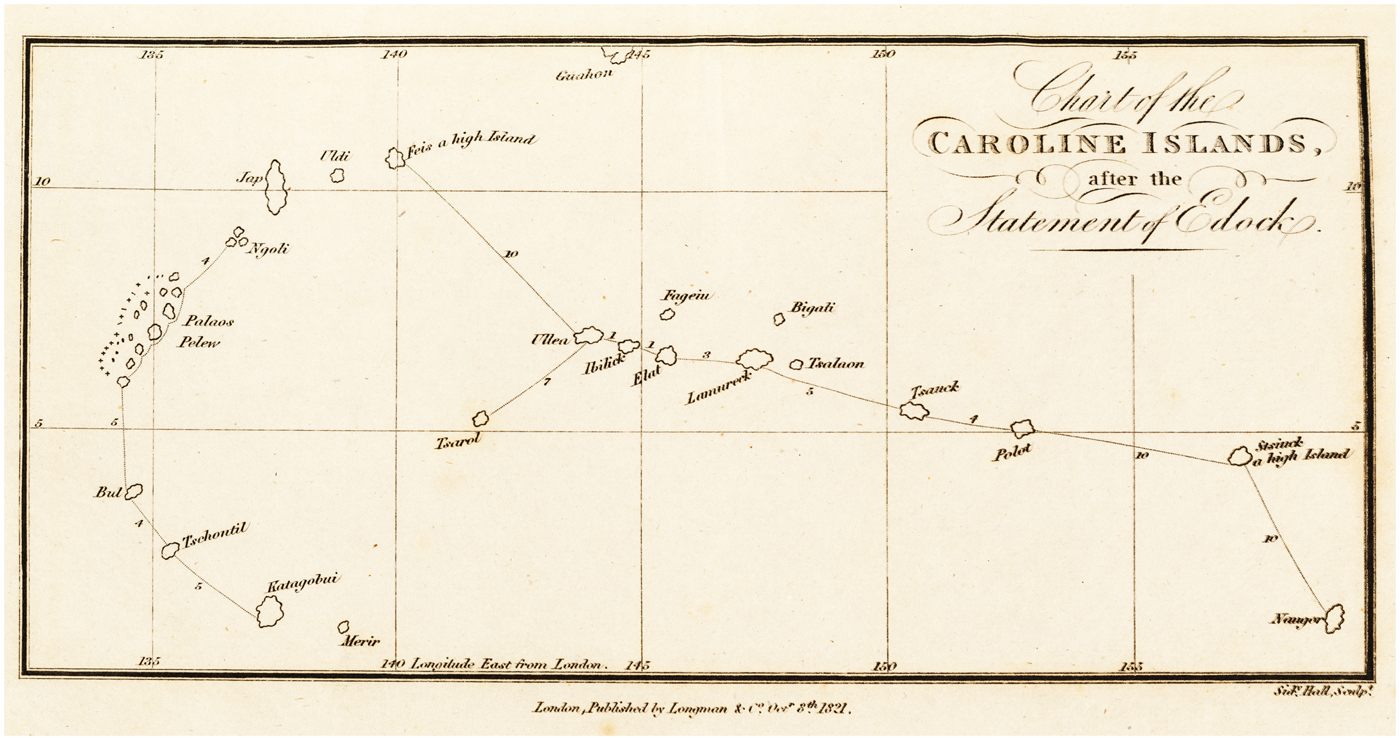 Fig. 6. Otto von Kotzebue, ‘Chart of the Caroline Islands, after the statement of Edock’ (1821), in A voyage of discovery into the South Sea and Beering's Straits, for the purpose of exploring a North-east Passage undertaken in the years 1815–1818…in the ship Rurick…, ii, endmap, National Library of Australia, Canberra, NK 921
