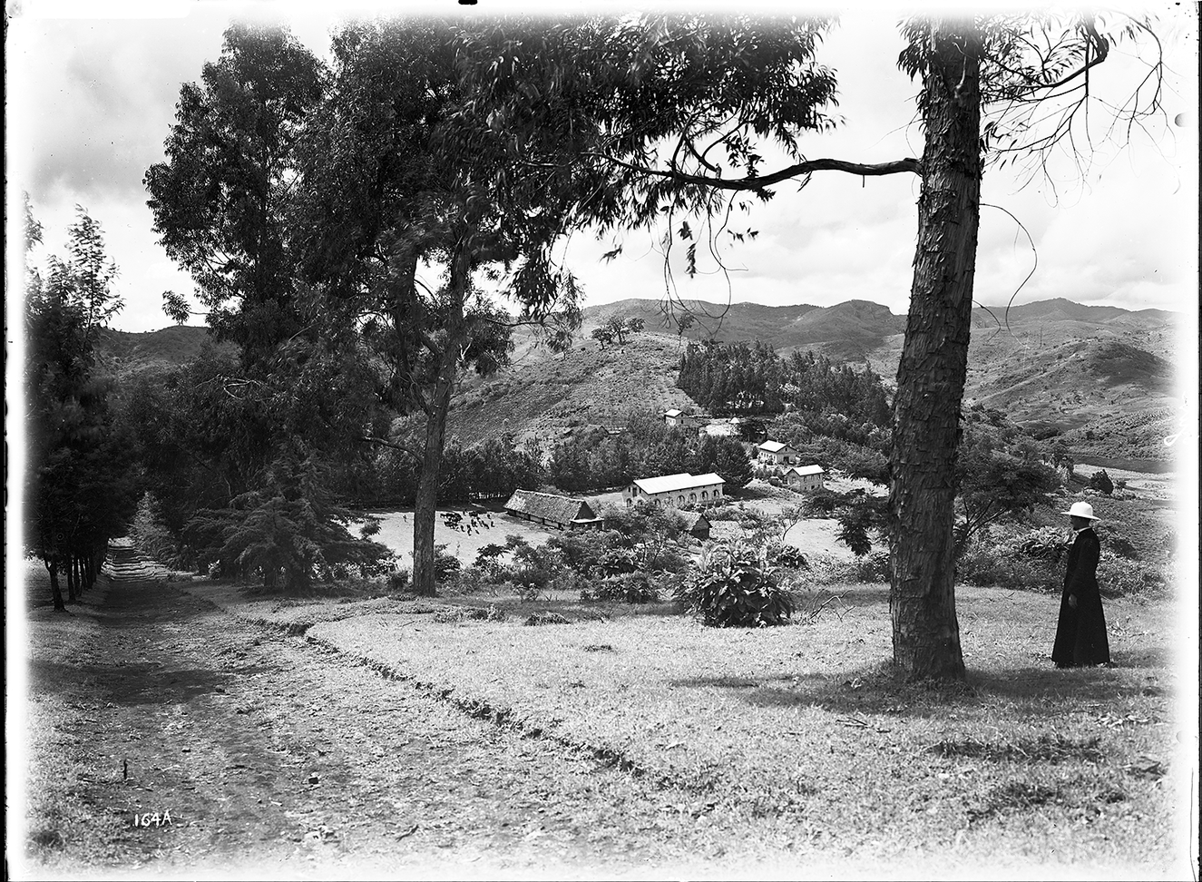 Figure 2. Gare Mission, West Usambara Mountains, c. 1913. Photograph by Walther Dobbertin. At the Trappist monastery, the vegetation is almost entirely exotic, including Eucalyptus in the foreground and lining the roadway leading to the mission complex. German National Archives index number: Bild105-DOA164 TIF.