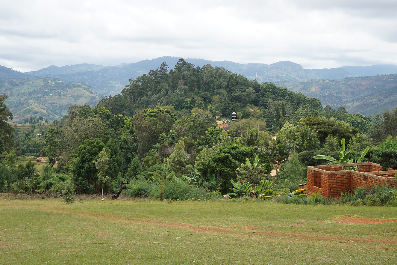 Figure 3. Gare Mission, 2016 (compare with Figure 2). A far less open landscape greets today’s visitor. On the hillside behind the Mission, exotics like Eucalyptus, Grevillea, Norfolk Pine, and Jacaranda, to name a few, have grown into a forest that serves as a site for festivals and pilgrimages. In the foreground, farmers have now established shambas on a section of the former mission property where they have planted small gardens of banana and avocado.
