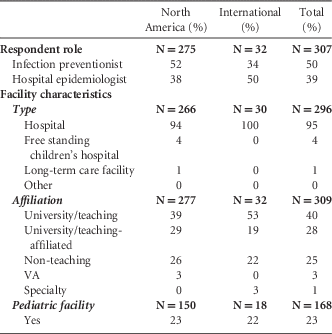 Of 1,520 SHEA members, 314 SHEA members and members of the SHEA Research Network responded to the survey, for a 21% response rate (Table 2). The majority of respondents were from North America (United States and Canada) (89%). Most worked at hospitals (91%); an additional 4% worked at freestanding children’s hospitals; 1% worked at long-term care facilities; and 0.3% worked at freestanding clinics. Of 168 respondents, 23% represented a pediatric facility. The majority of responses were from either university/teaching hospitals (40%) or university/teaching-affiliated hospitals (28%). We received additional responses from nonteaching hospitals (25%), Veterans Affairs hospitals (3%), and specialty hospitals (1%). For hospitals, the mean number of licensed beds was 496. Most respondents were either infection preventionists (50%) or hospital epidemiologists (39%).